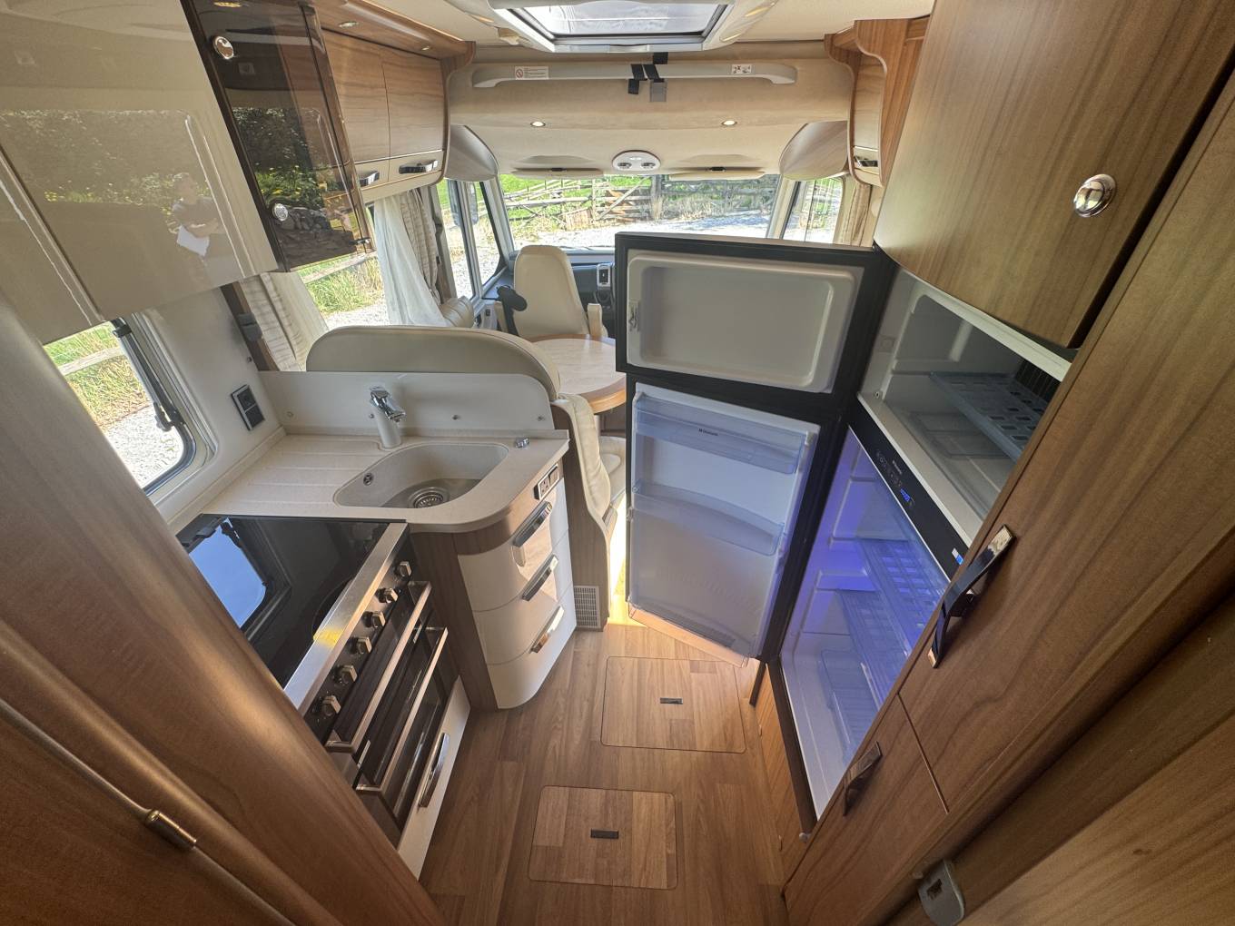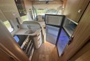 Carrying on through the motorhome, we come to the kitchen area where there is an oven along with a 3 ring gas hob supplied from the gas bottles the external storage locker. Next to the cooker is the sink with mixer tap and last but not least there is a large 3 way Dometic fridge with freezer compartment.