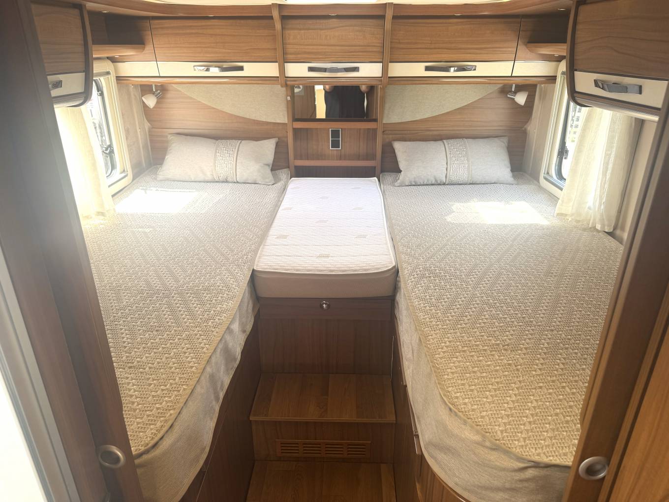 Starting with the rear of the motorhome, you have the extremely large fixed elevated Twin beds which are surrounded by multiple spot lights with plenty of storage space in the overhead cupboards. With the extra bed infill piece, this also makes a very large king size bed. Underneath the bed is the large garage which has plenty of room to store items such as a drive away awning, bicycles, luggage and many other items.