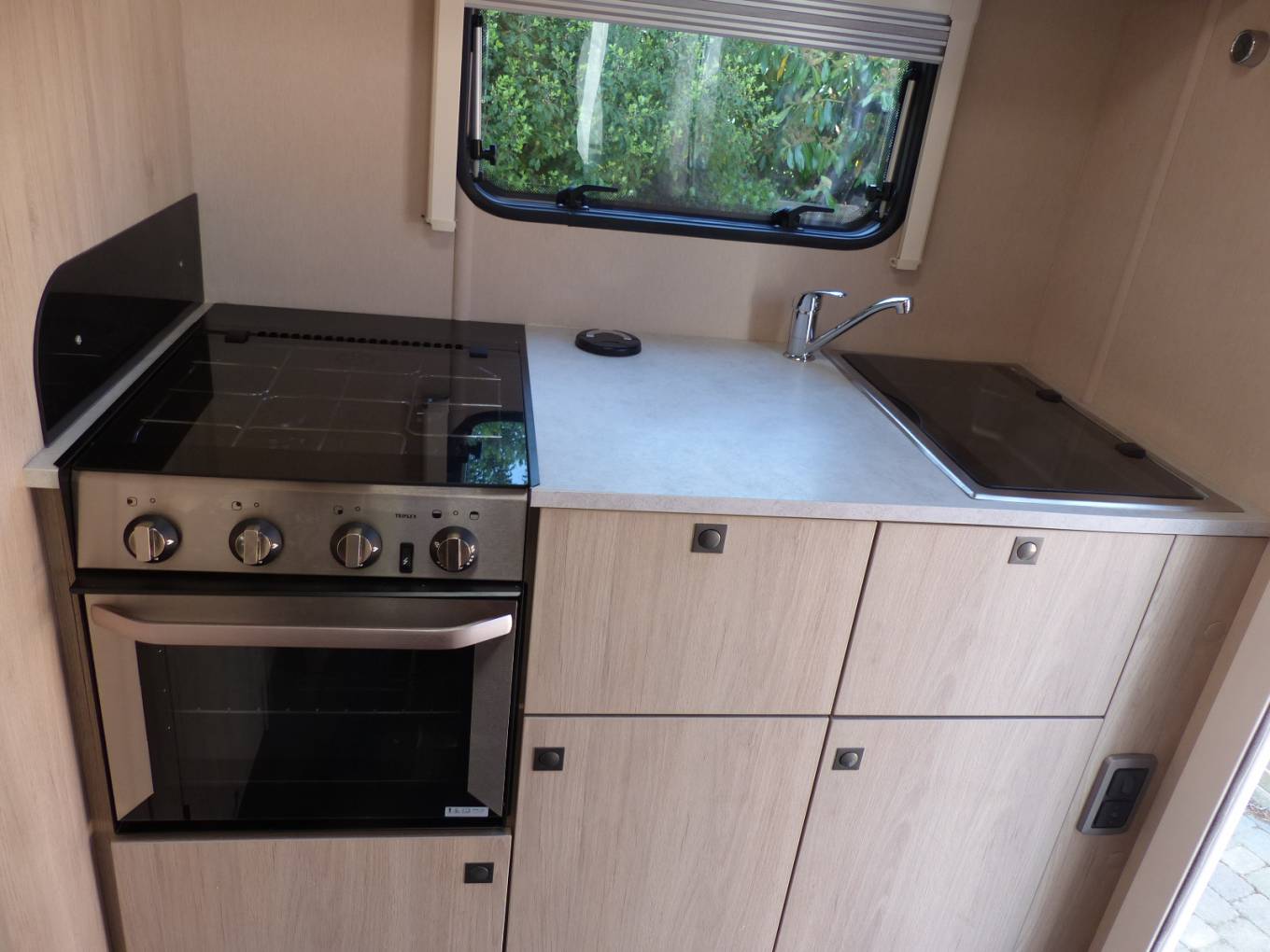 The front L-shaped lounge has 2 forward-facing travelling seats and converts into a double bed in addition to the overhead cab double bed, which is accessed via a ladder. The rear kitchen benefits from a cooker with a 3-burner gas hob & combination grill/oven, an 85-litre refrigerator with a removable freezer compartment and a stainless steel sink with mixer taps and a glass lid. The offside rear corner washroom features include a Thetford toilet with electric flush, a sink, a large mirror and a separate shower cubicle.