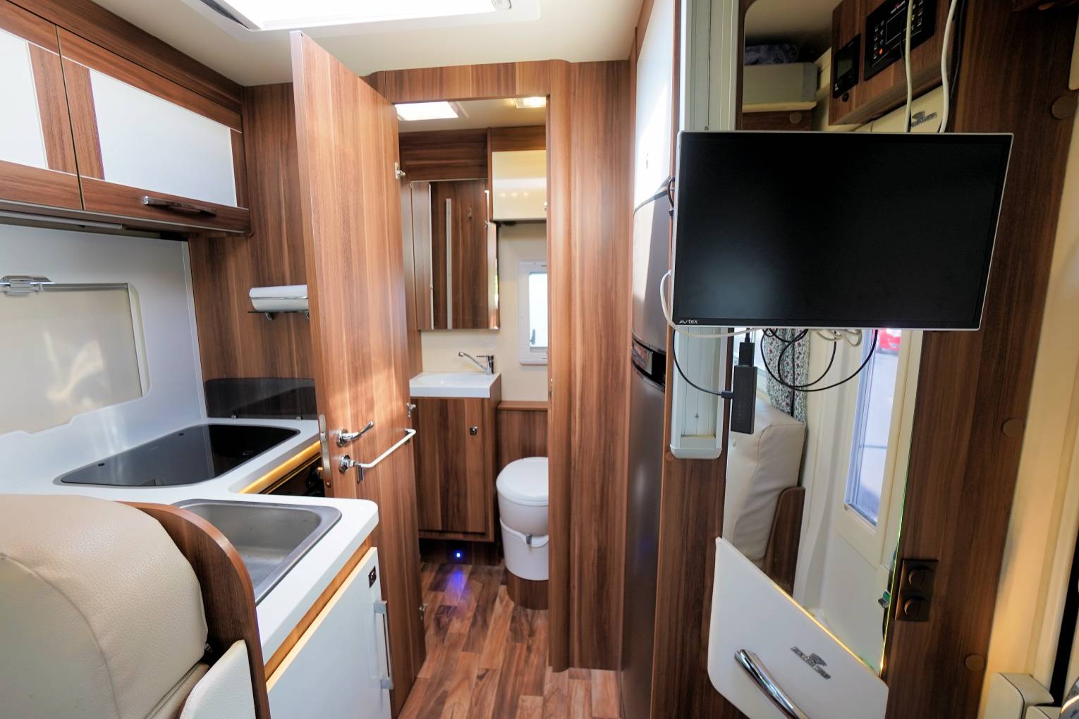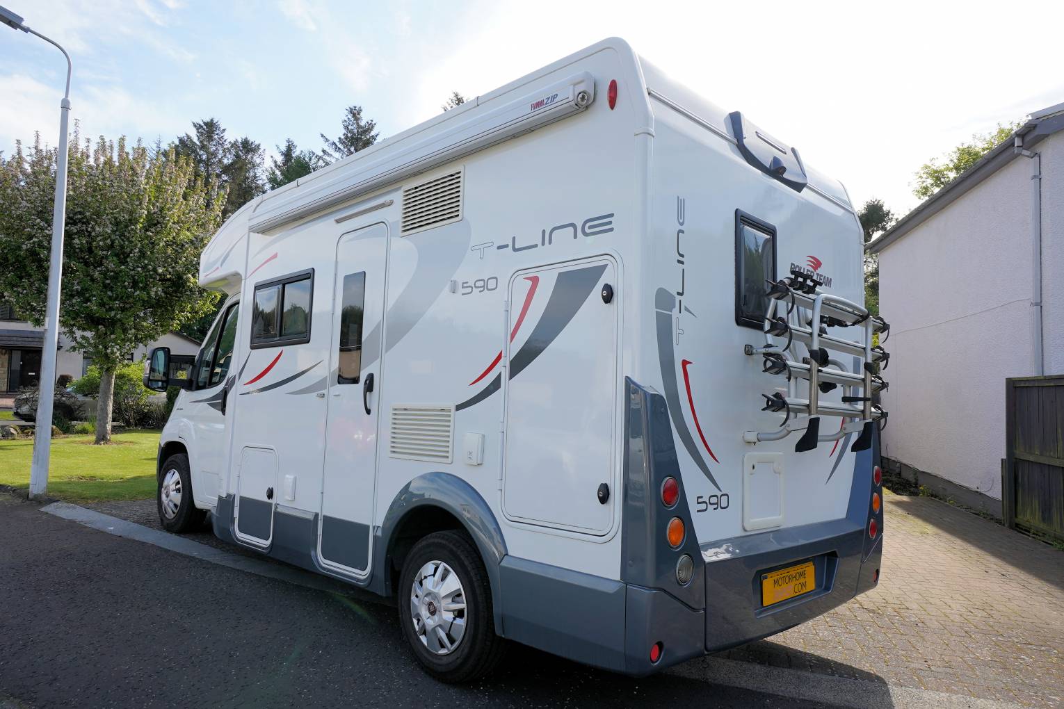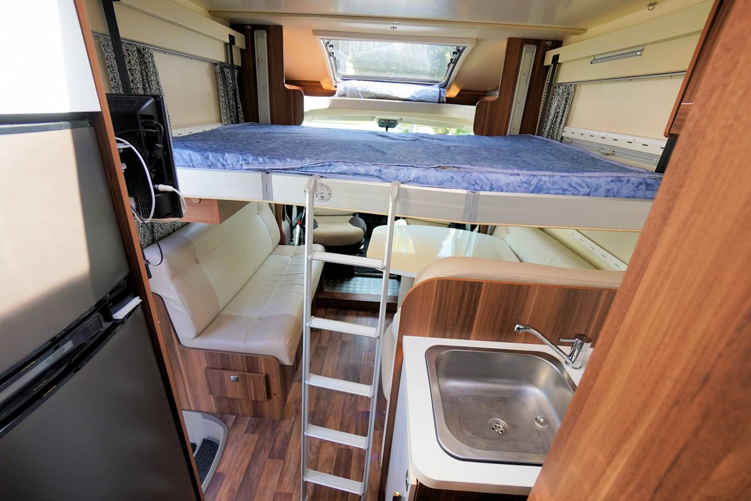 For sale we have a 2018 Roller Team T-Line 590 with 4-berths, 4-seatbelts, drop-down electric double bed, end-washroom with separate shower unit, all fitted into a motorhome less than 6.0m in length.