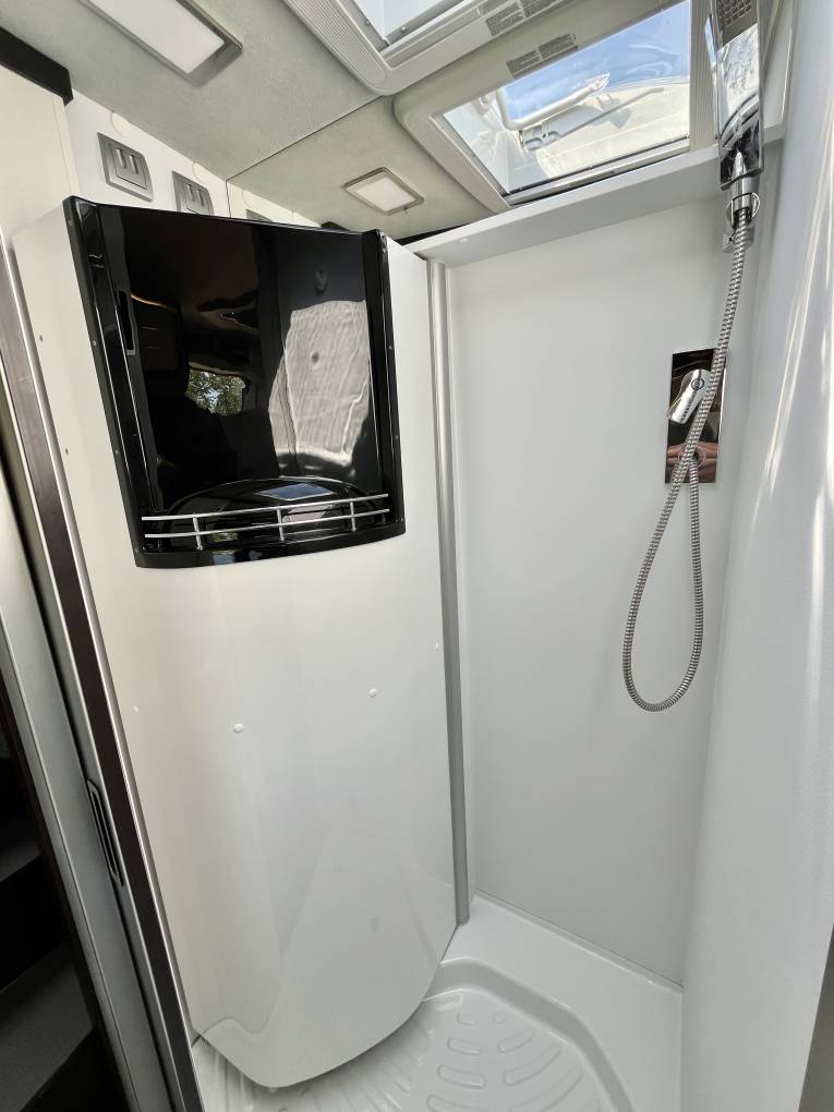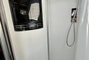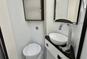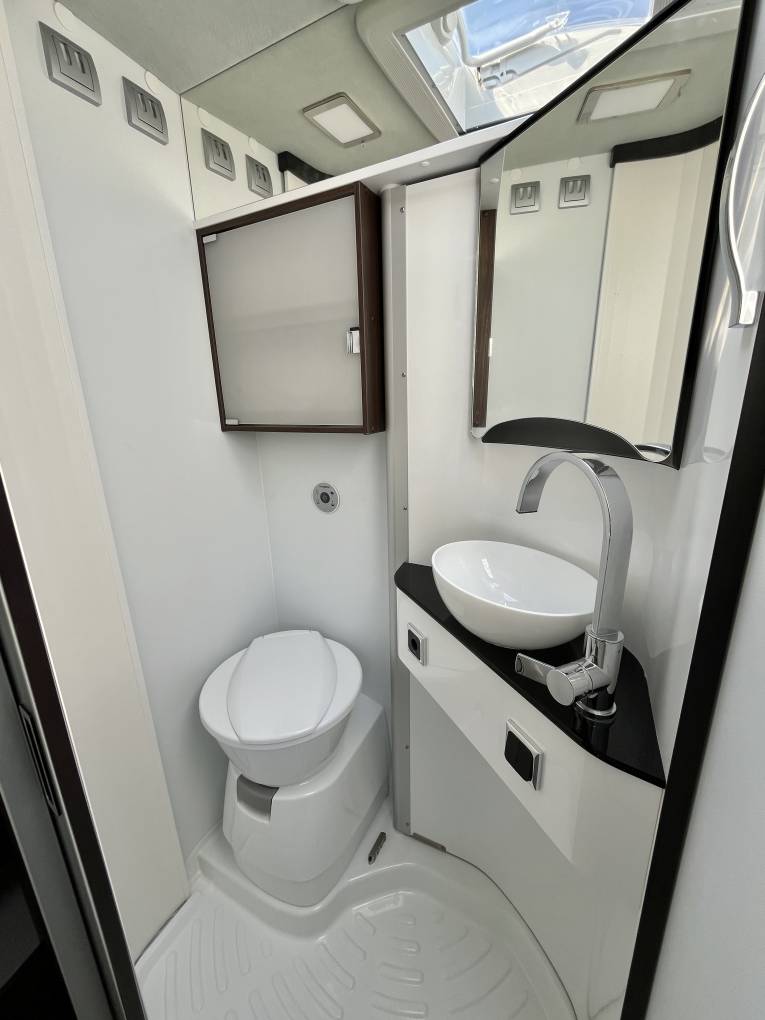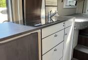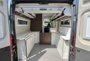 To the rear of the seating area we have a spacious kitchenette with twin hob and sink, additional pop up worktop space, plenty of storage options below and a clever double hinged fridge to enable access both from inside and outside of the van. Opposite is a good sized washroom with electric flush toilet, hand basin and mixer tap plus further storage and mirrors, pair this with the clever technology of the ingenious swing wall to create a separate showing area you have a very usable space, allowing you to stay refreshed on your travels.