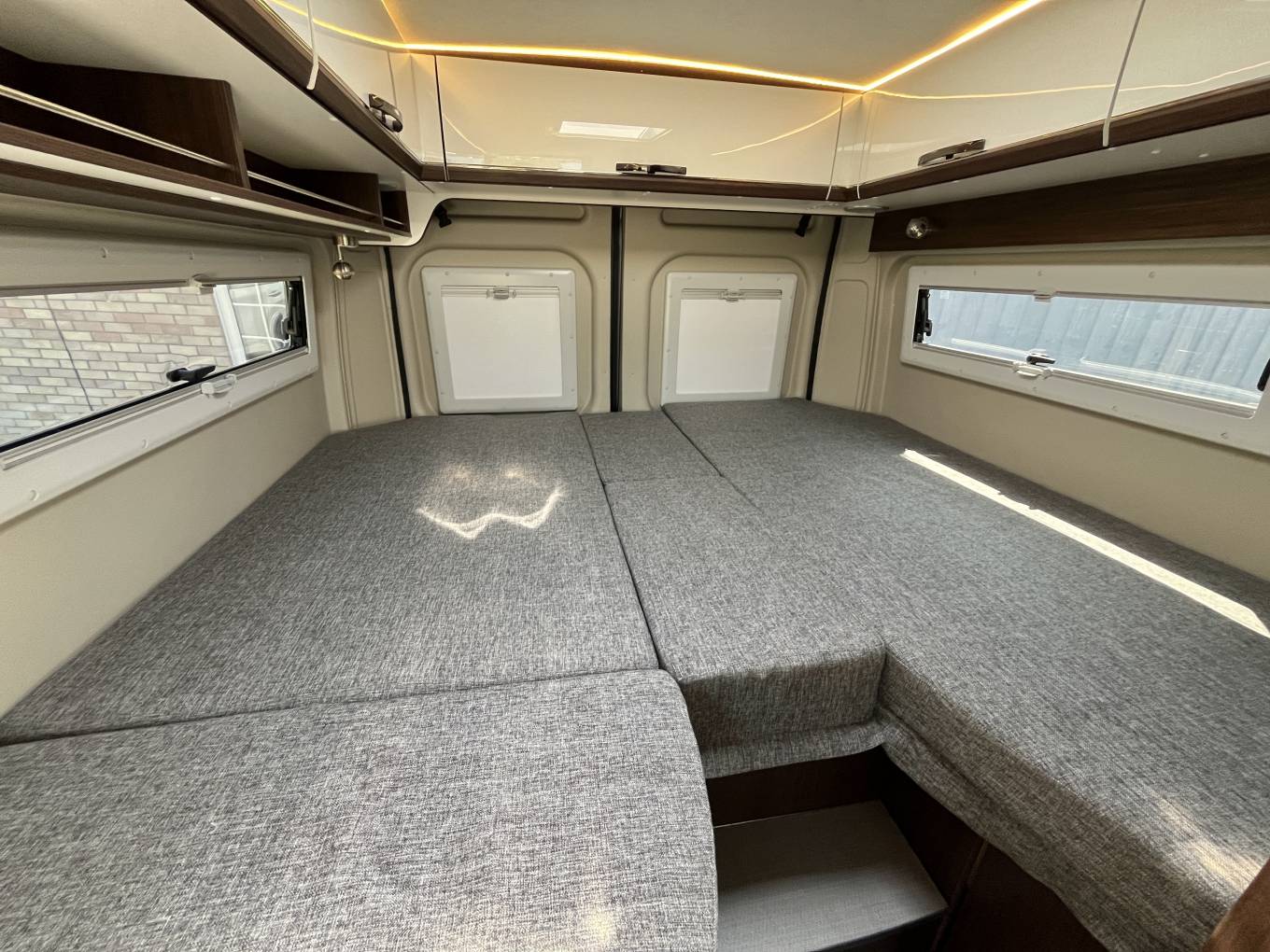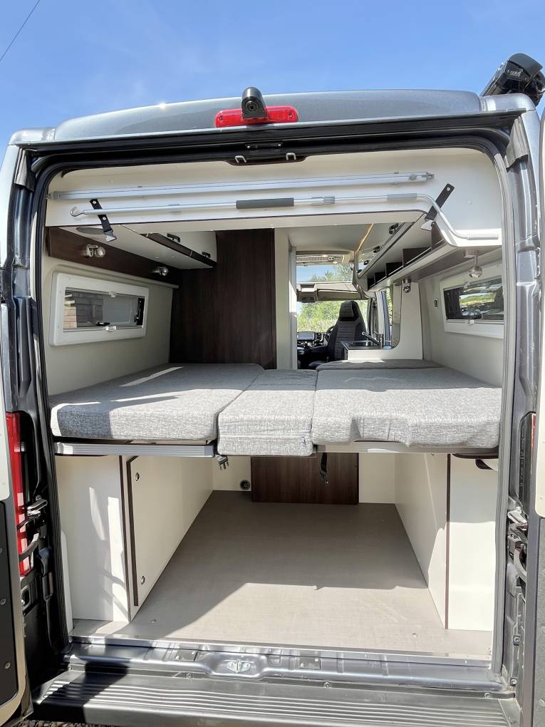 Finally to the rear we have very good sized single beds with multiple storage cupboards above, hanging wardrobe below and a large storage space below the beds, accessible from both inside or outside the van, the comfortable sleeping area can be converted into a larger garage if required.