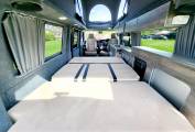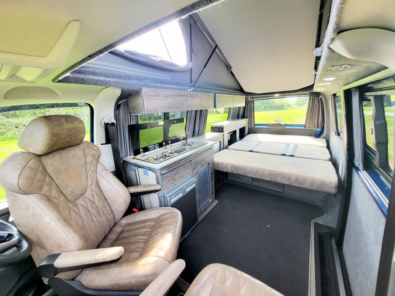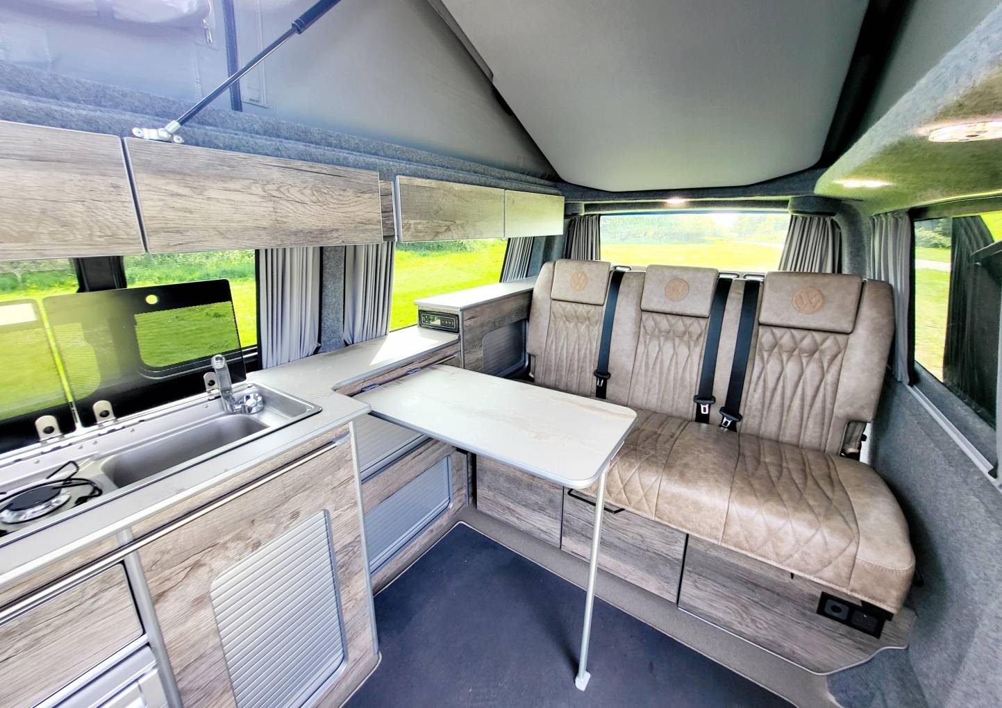This Fantastic Brierywood campervan conversion layout boasts a larger premium M1 tested 3-seater 129 RIB Altair bed system with an integrated slider and headrests in response to a growing demand for a larger sleeping space.