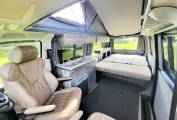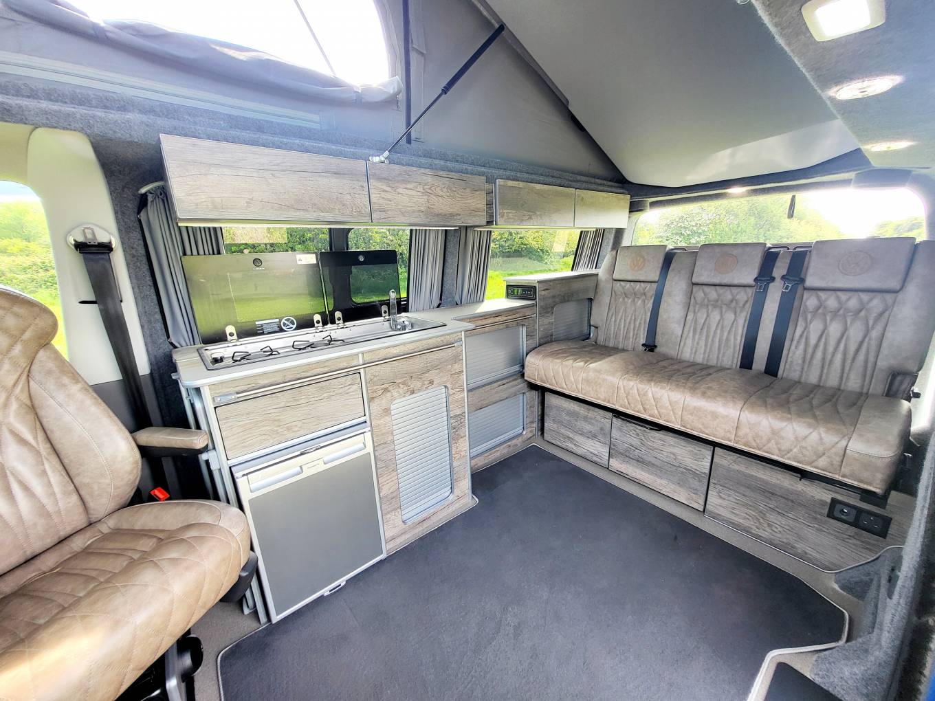 This Conversion has the premium SCA roof to include integrated deluxe mattress, Webasto diesel heating, diamond stitched leather upholstery, sports front seats and LVR external body styling which adds to its road presence and overall stance, this 5 seater, 4 berth, campervan has been designed for luxury camping.