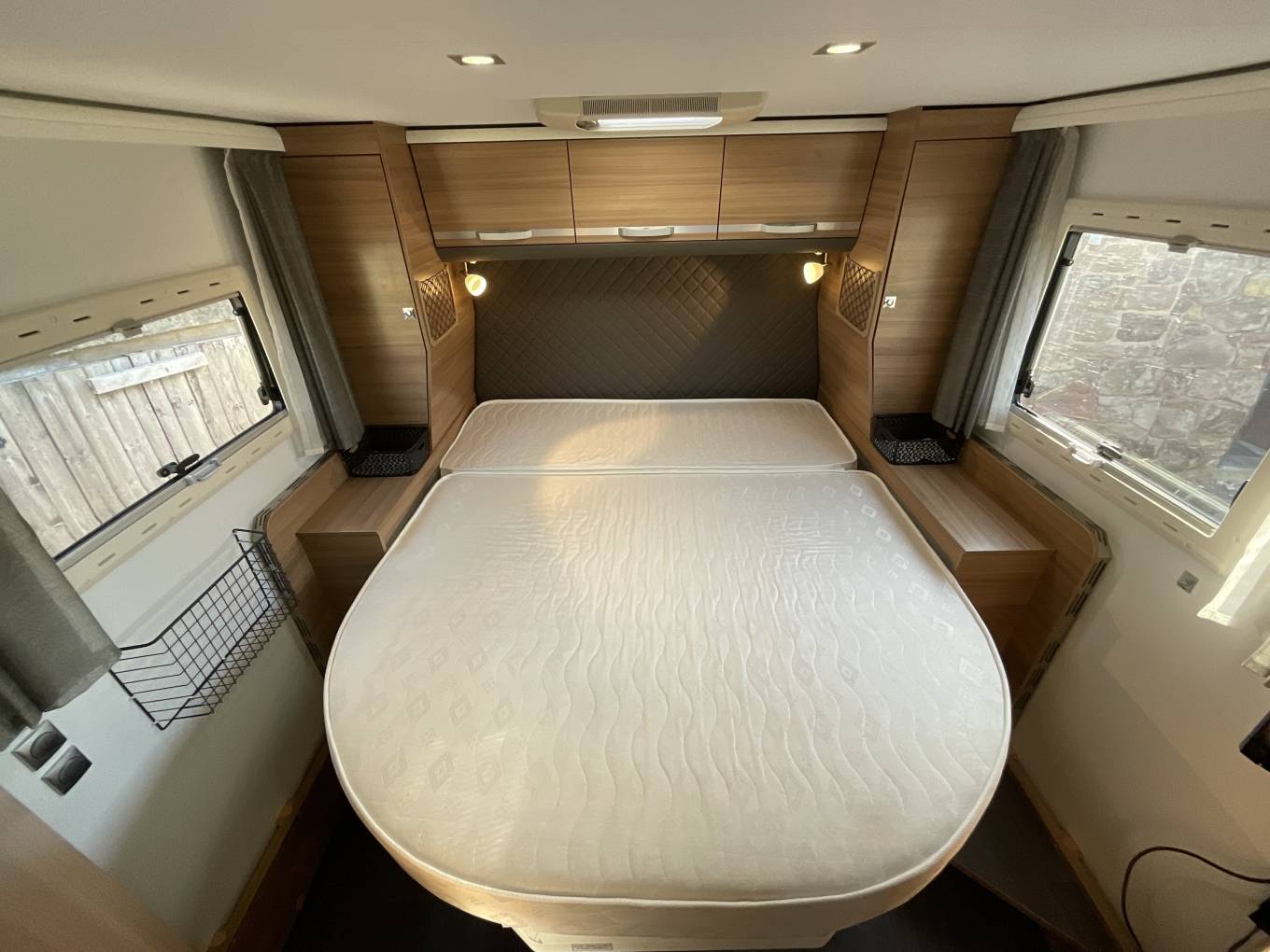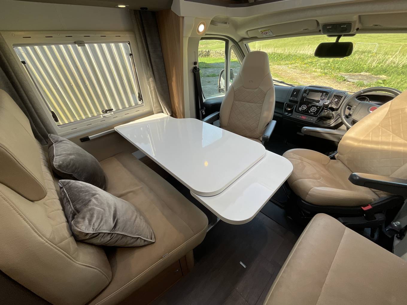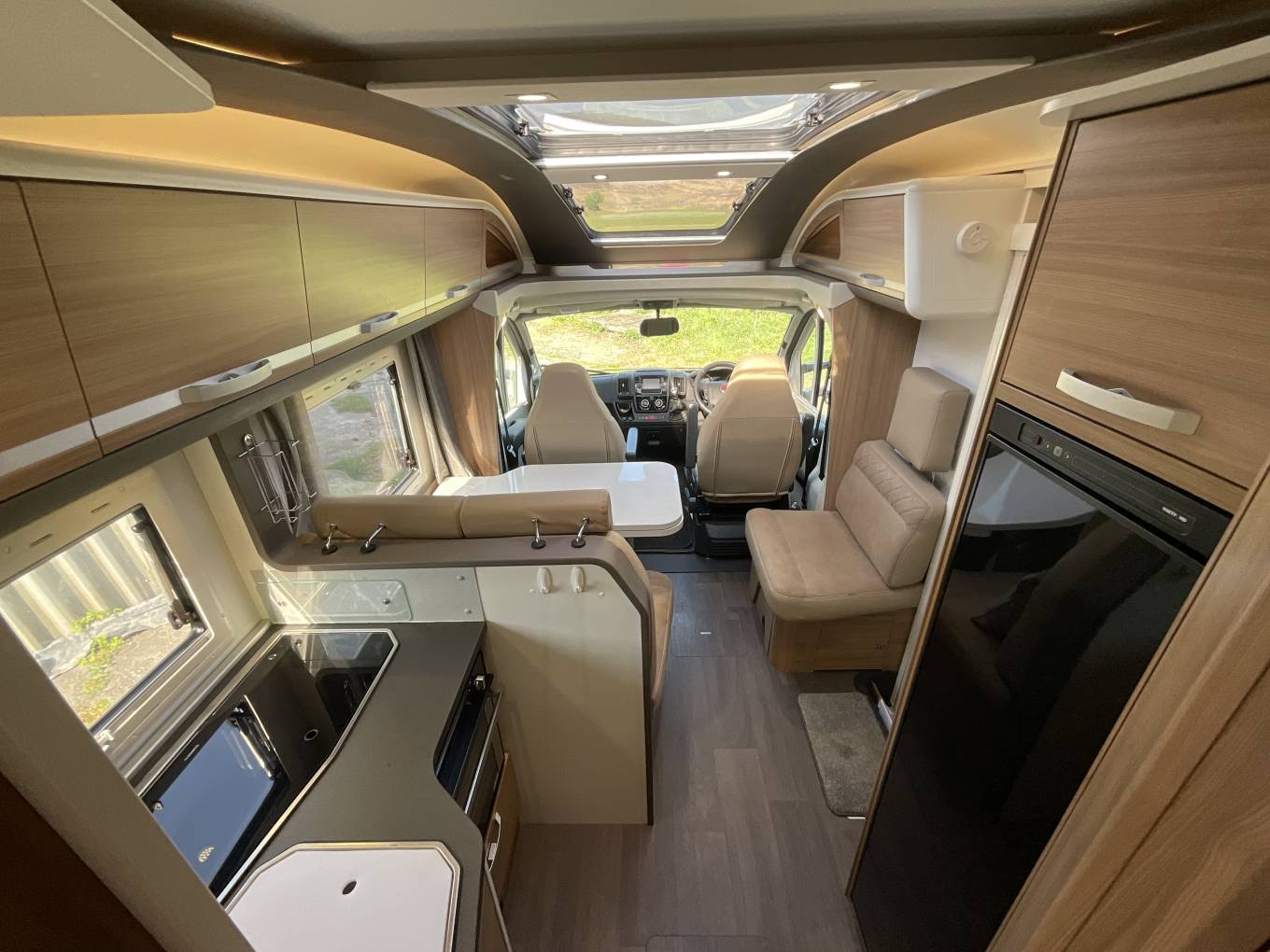 Modern Features – Truma Combi heating and hot water system, LED lighting, reverse camera, solar panel, and integrated blinds/screens all around.