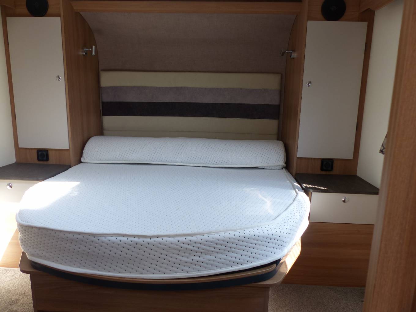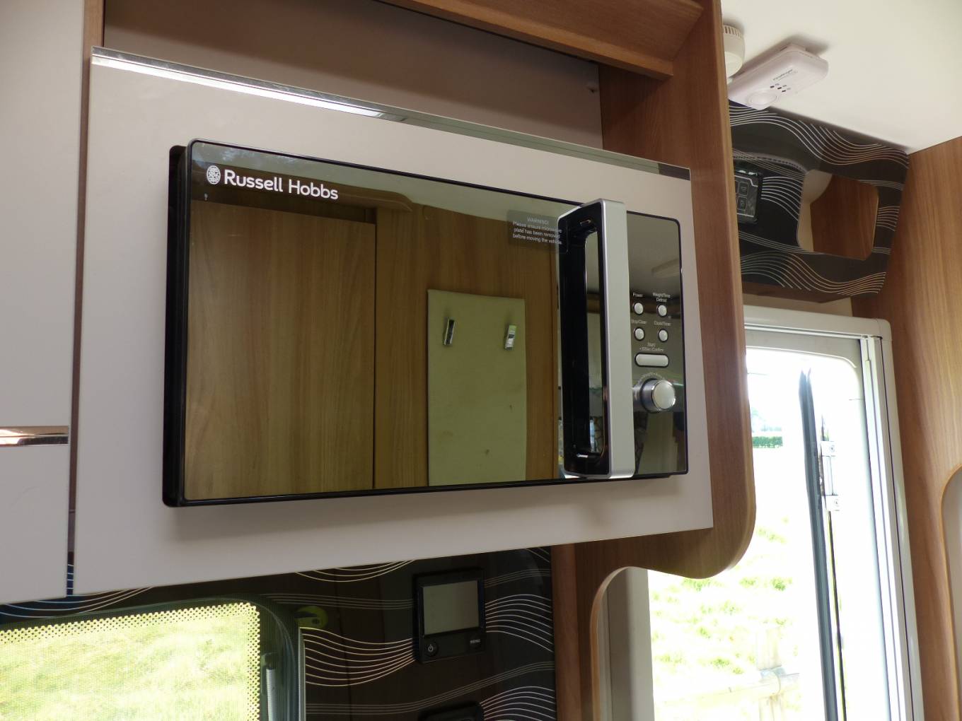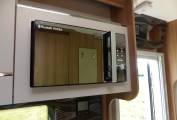 The kitchen provides 3 way full length fridge with separate freezer section, Thetford gas oven/Grill, Separate Thetford 3 gas, 1 electric hob with glass lid. There is ample under counter and overhead storage cupboards and draw units. Russell Hobbs built in microwave, Kitchen counter extend option.