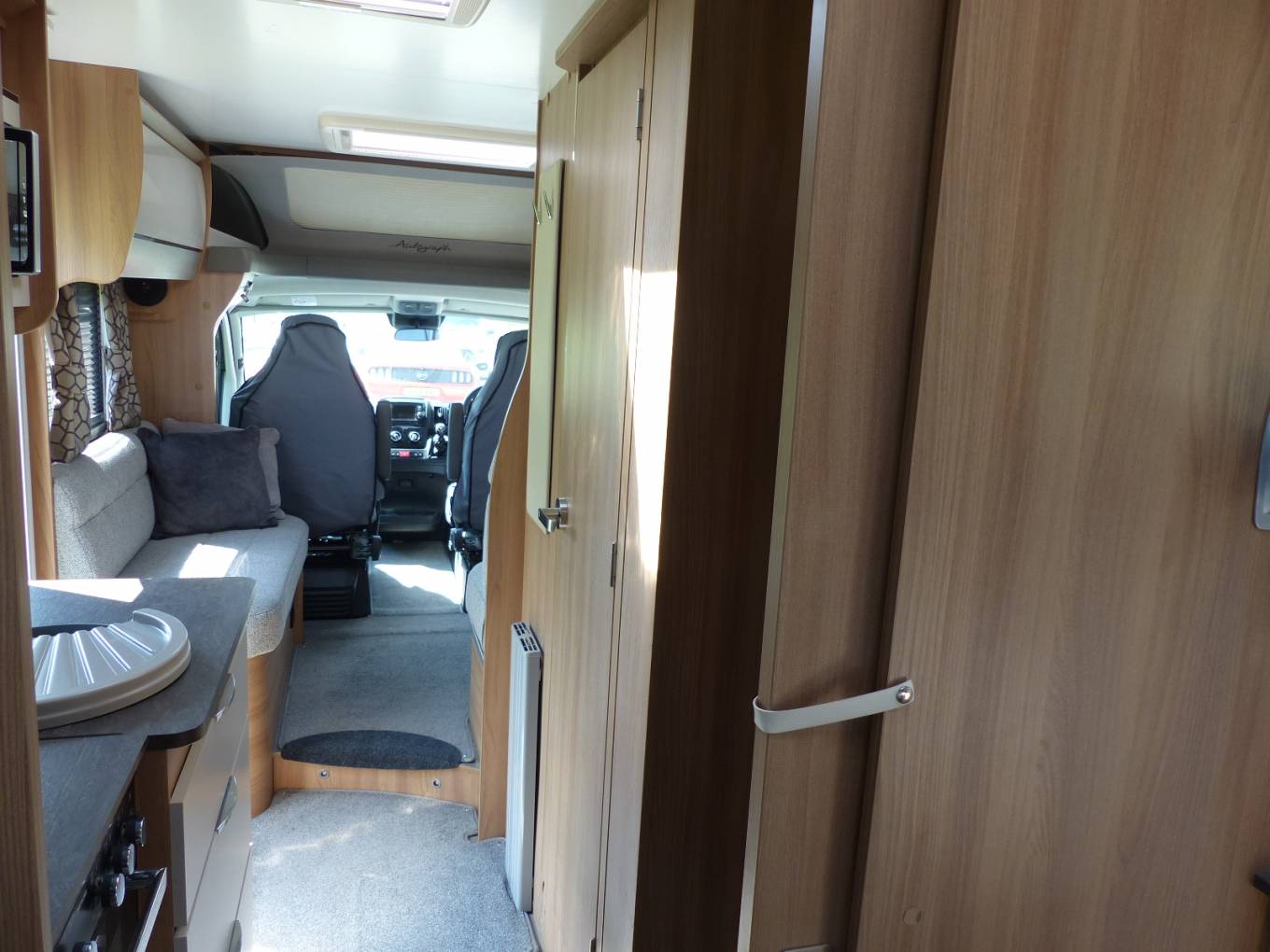 Opposing the kitchen is the spacious washroom benefits from the separate shower with glass shower screen divide. Tall glass mirror and large wall Cupboard. The motorhome also benefits from Alde Central heating perfect for overall distributed heat throughout.