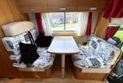 The dinette area with the four passenger seats, (two front facing and one rear facing have 3-point seatbelts) is located to the front of the motorhome and together with the table provides a great dining area which easily converts to a compact double bed.