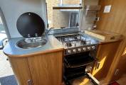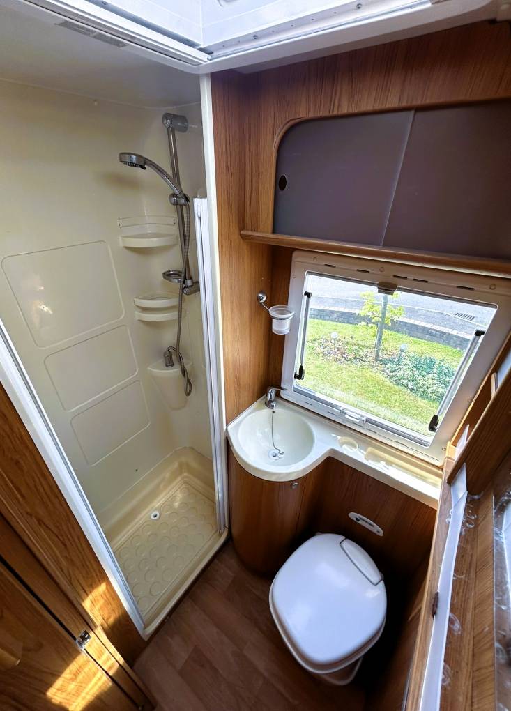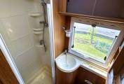 The washroom is located to the centre of the vehicle and comprises of a Thetford cassette toilet, vanity hand wash basin and shower with screen.