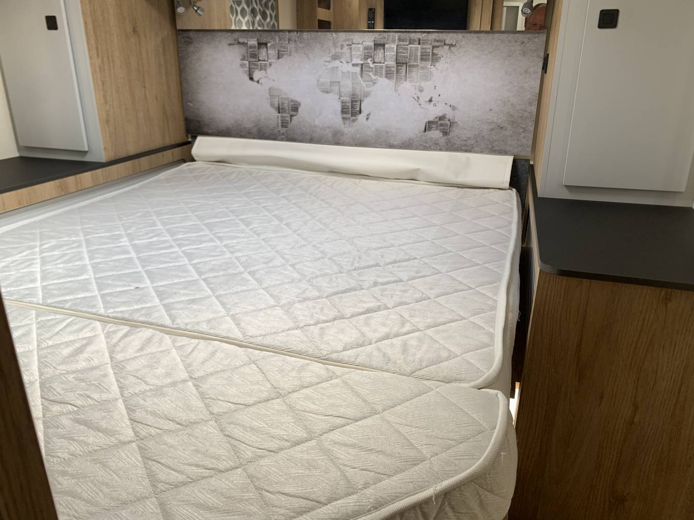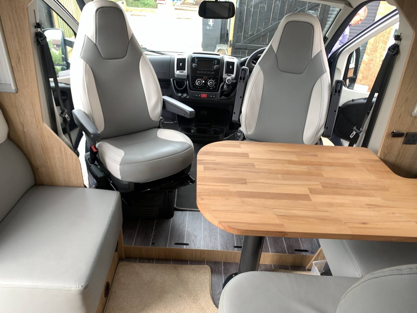 Layout features a rear bedroom with height adjustable large island bed that can be closed off with sliding wooden doors, the bathroom divides the front from the rear of the motorhome with a centrally mounted wash basin, a shower cubicle to one side and a cassette toilet to the other.