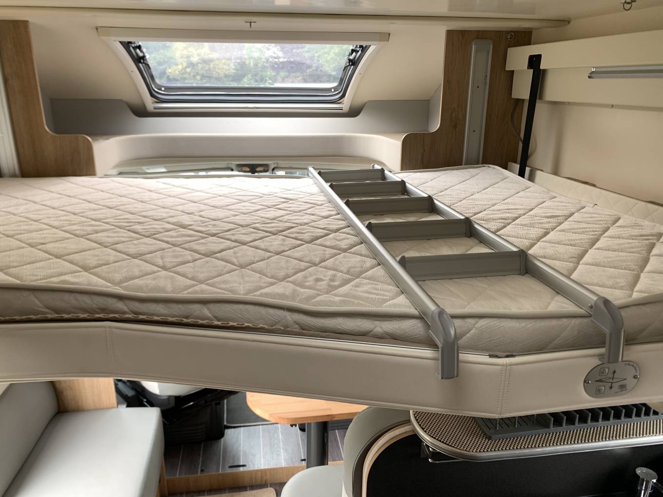An electric elevating double bed provides additional sleeping above the lounge area, the well equipped kitchen has a large fridge/freezer, 3 burner gas hob and gas oven/grill.