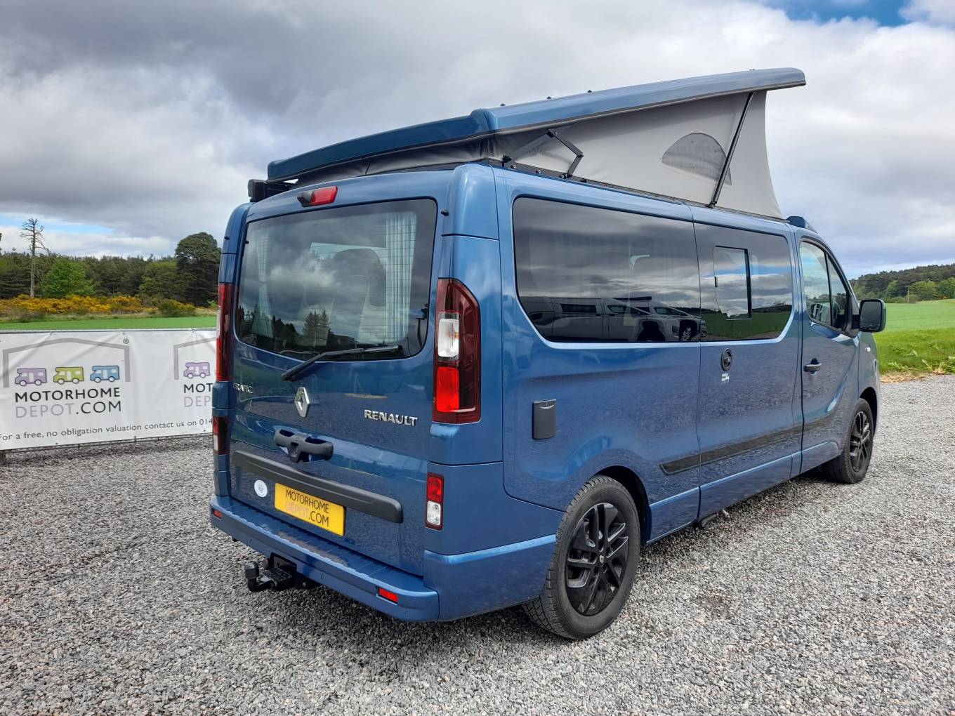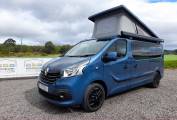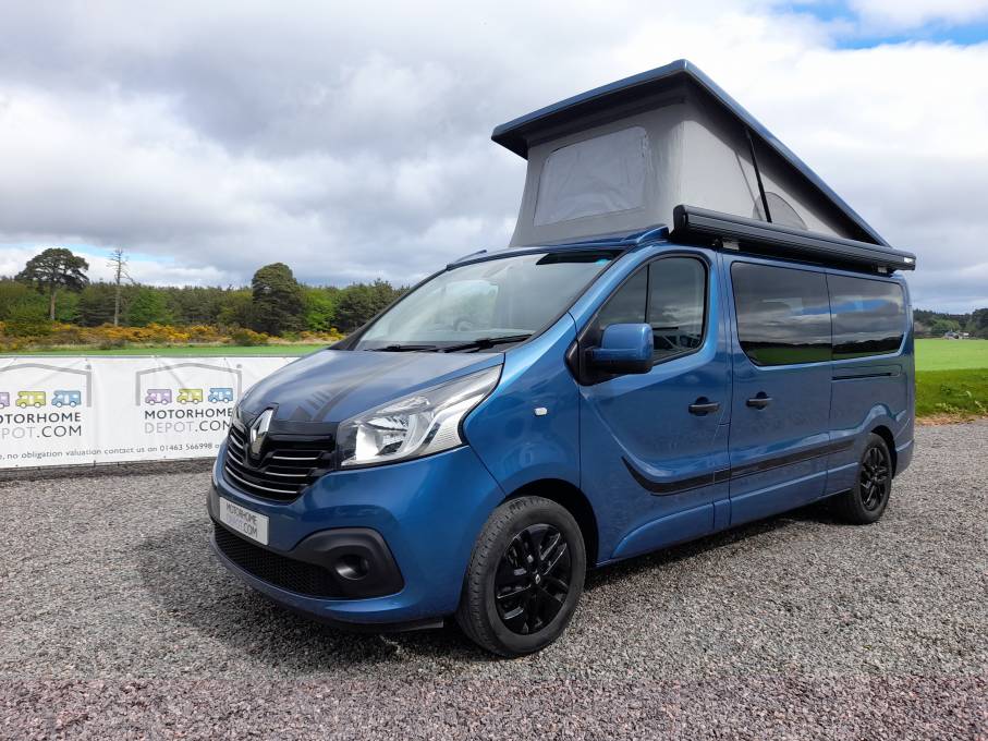 Motorhome Depot Inverness are pleased to have this 2019 Caledonian camper conversion Renault Trafic for sale, in a Bold Blue, sure to stand out against other Campervans. This Camper benefits from Air conditioning, Power steering, Sat Nav, Double Cab swivel seat, Media unit with Bluetooth and Sat Nav, Wind out Canopy awning, Blow up Drive away Kampa Air Awning and Tobar. This Camper also benefits from having Heating provided by a Propex Gas Heating system.