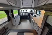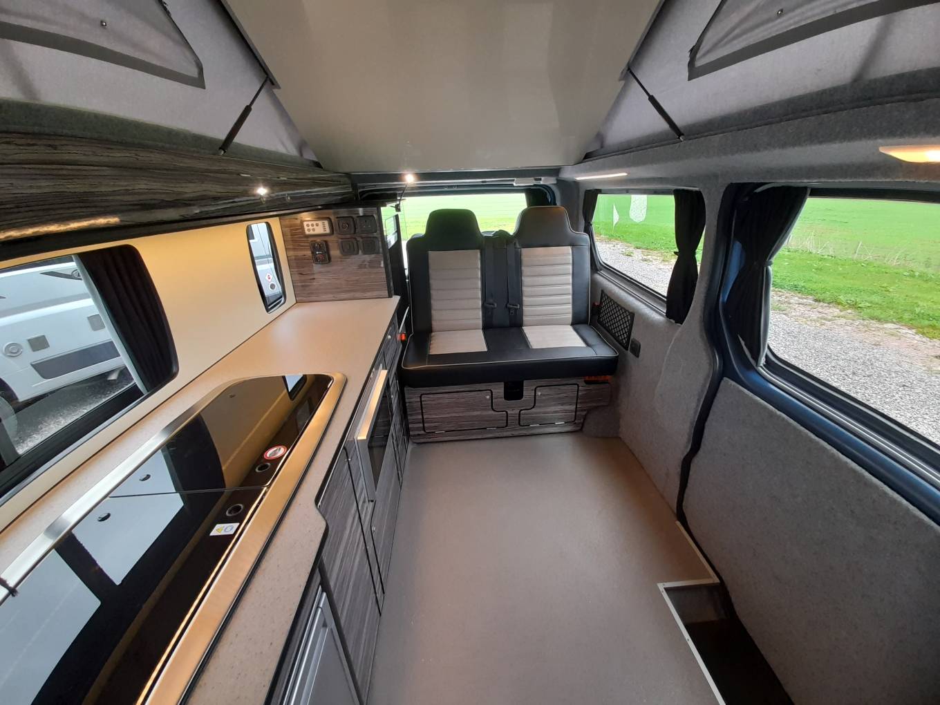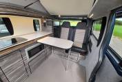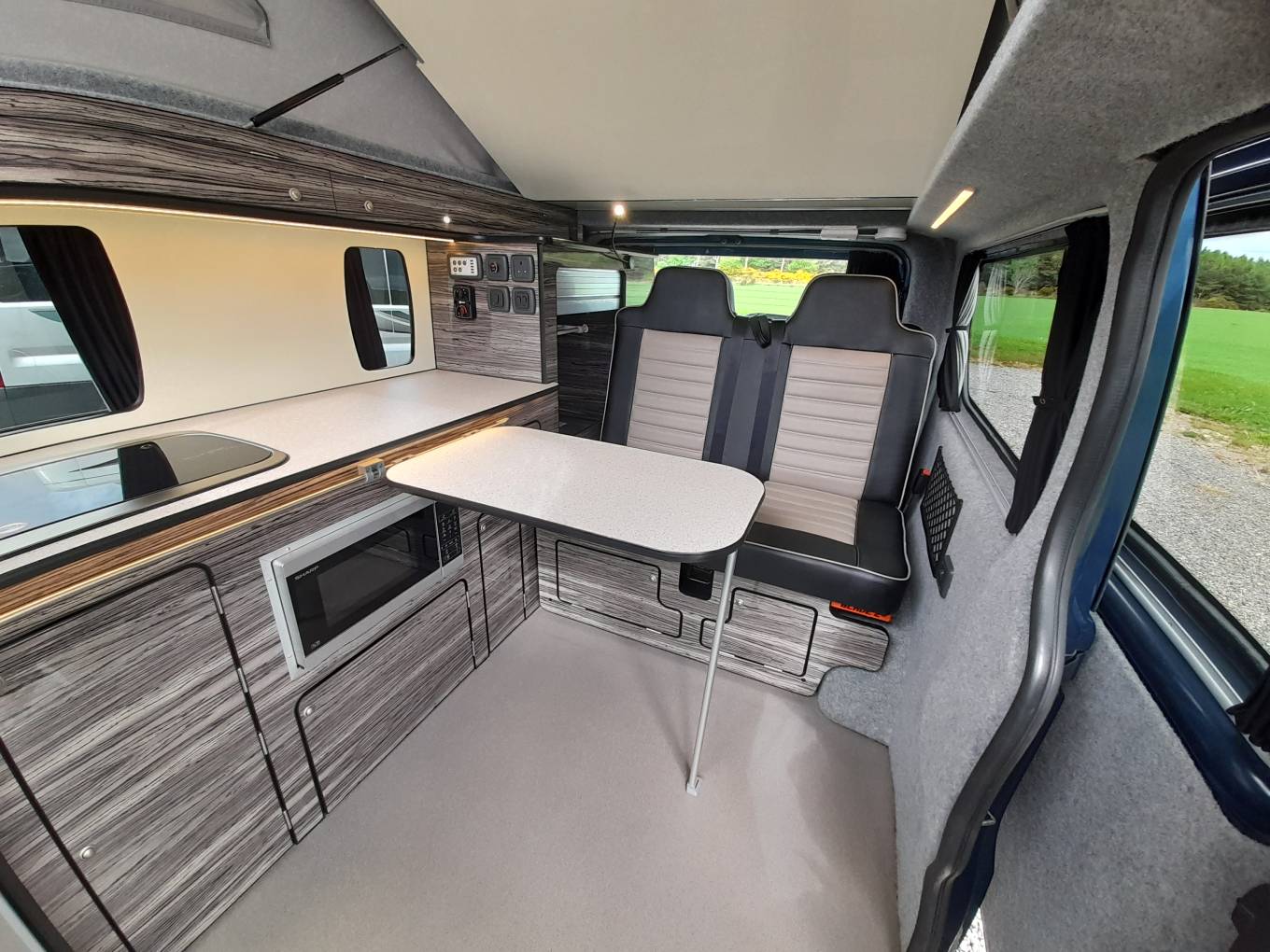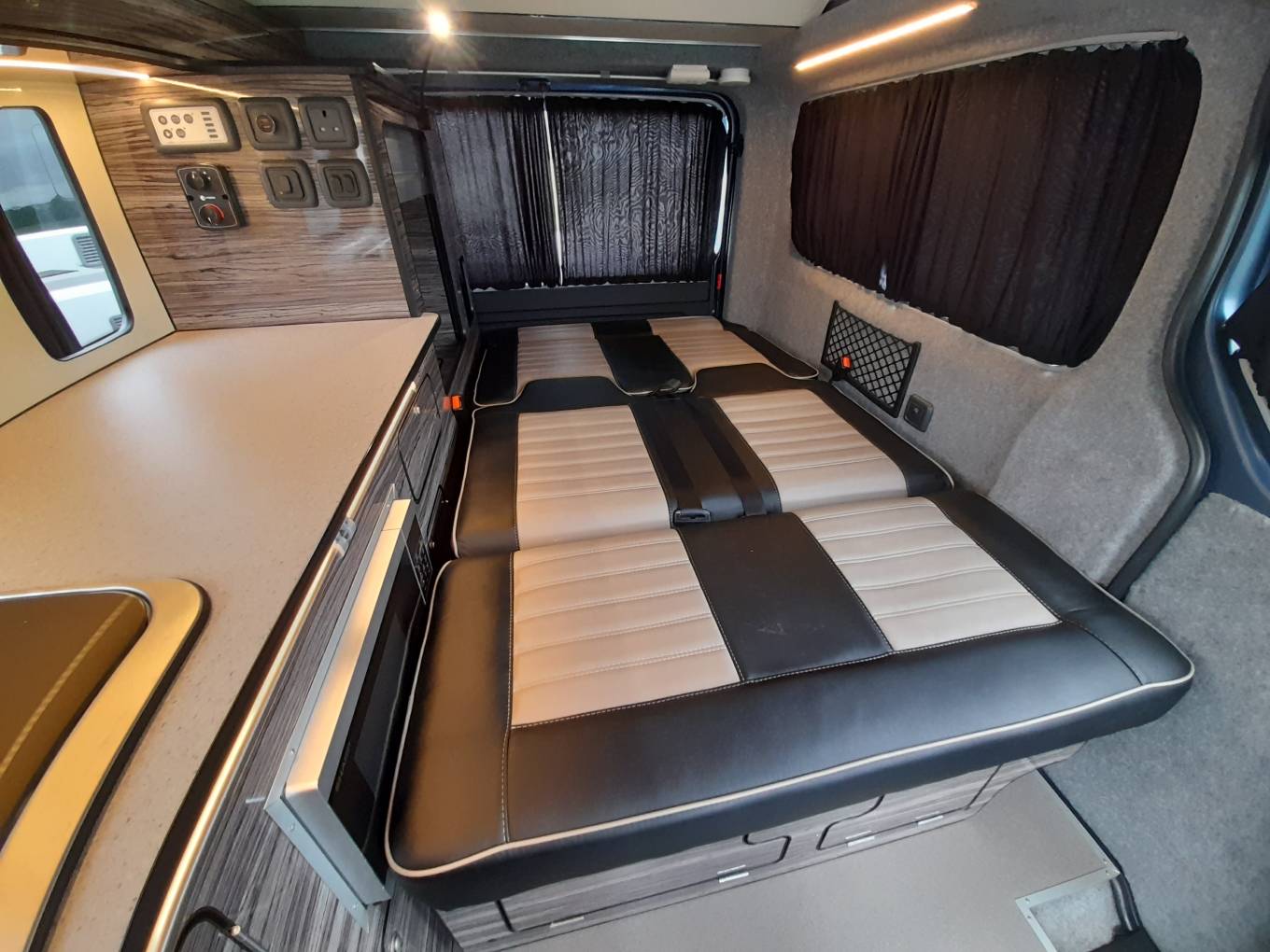 Kitchen – 2 x Gas burner hob, Sink with cold running water, 12v Fridge, Curtains on windows, lighting and both USB and plug sockets.