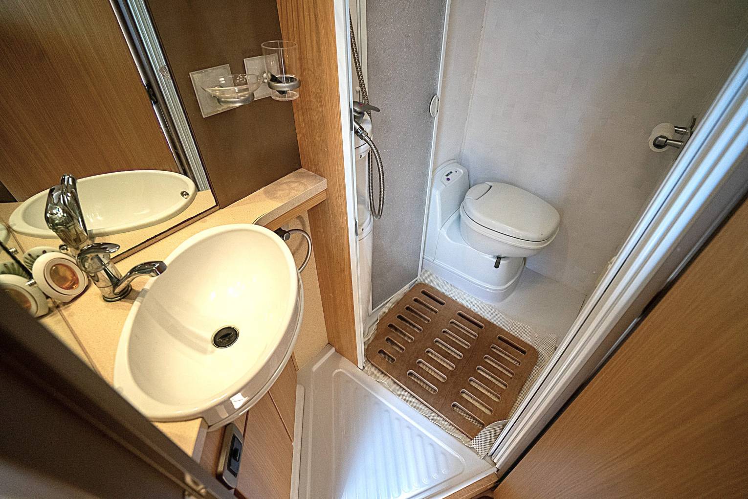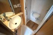 At the rear is the bedroom area with a comfortable fixed double bed next to a separate washroom with Basin, mirror, Cassette toilet and folding screens to give a self-contained shower cubicle. Next to the bathroom is a large wardrobe.