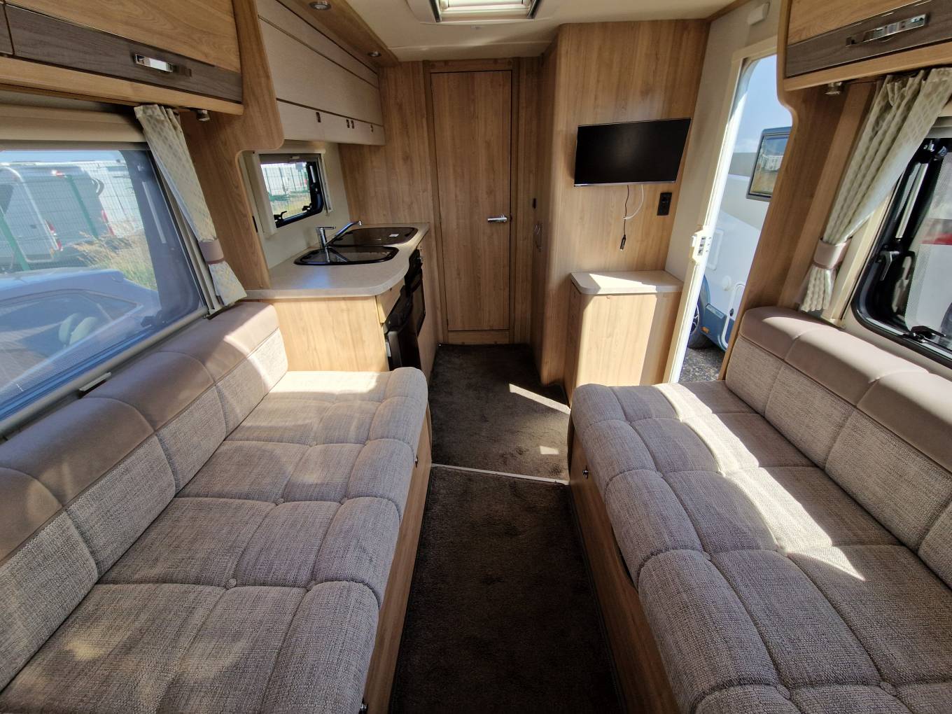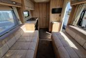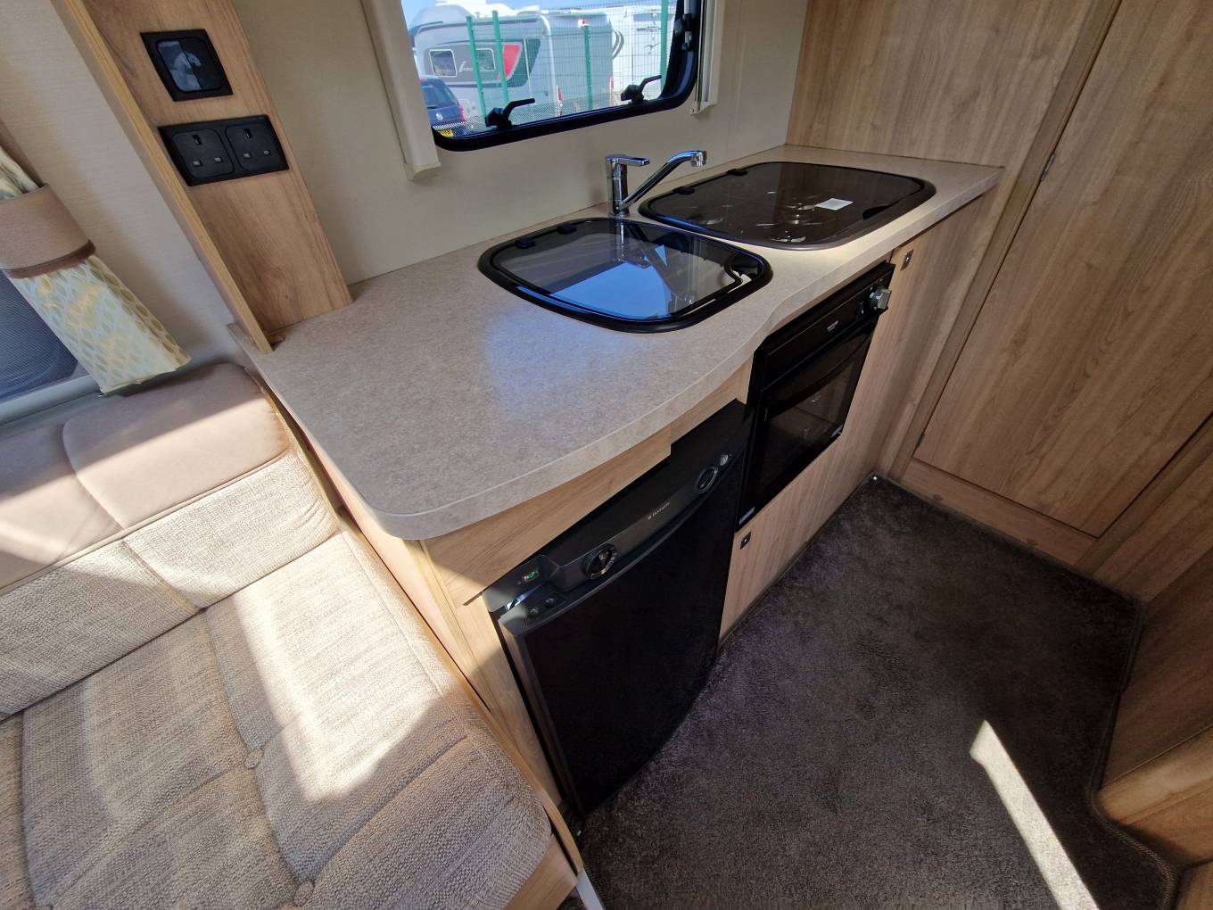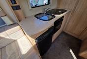 Next is the kitchen area which is placed centrally and features a combination oven and grill with a three-burner black enamel gas hob including high speed multi-function burner and spark ignition. There is also a 95-litre fridge with removable freezer unit and a sink. Above this is very generous storage.