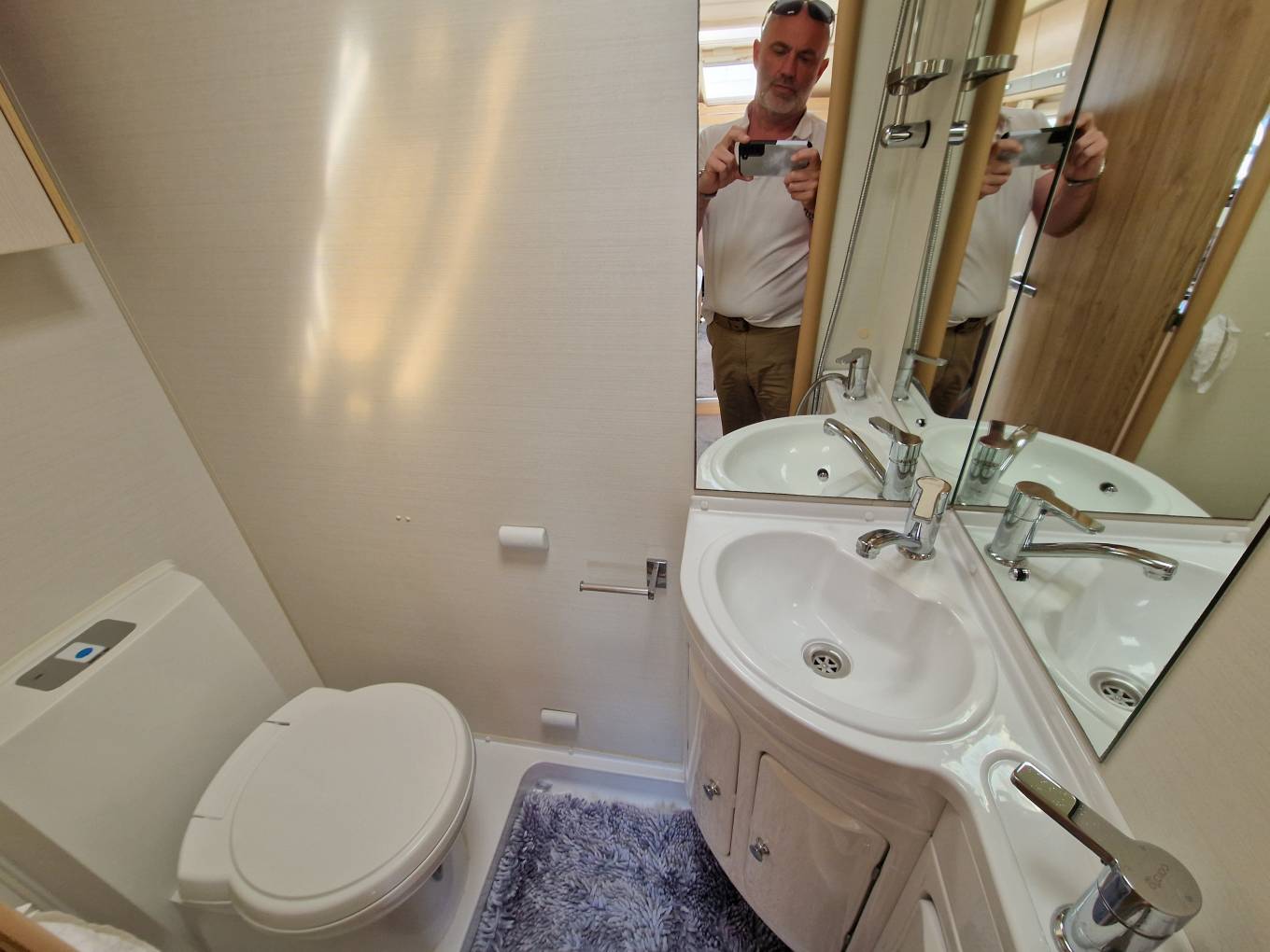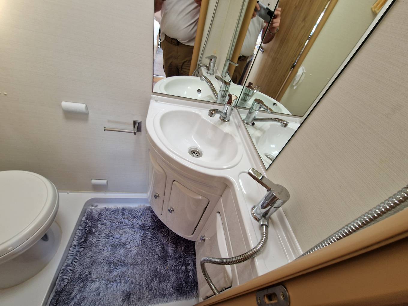 Entering the van from the passenger side, to the right at the rear is possibly the largest washroom one could expect in a compact coachbuilt – it stretches the entire width of the ’van. This huge area has a Thetford toilet, a shower, sink and storage.