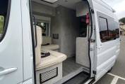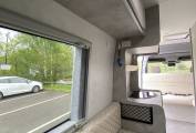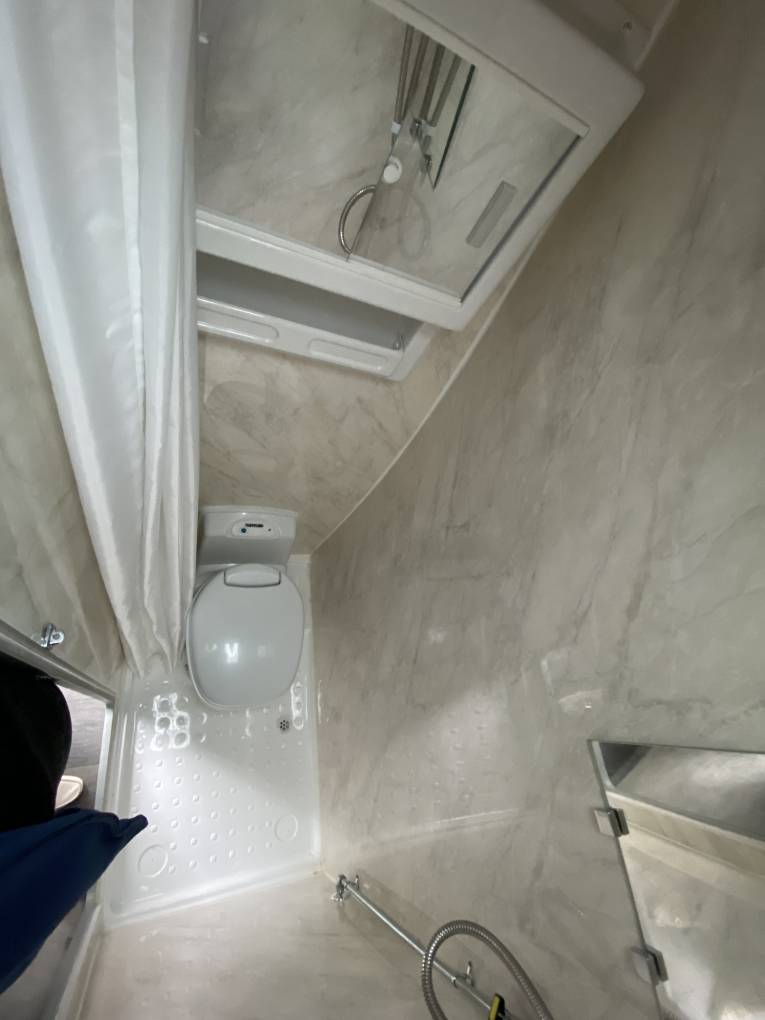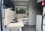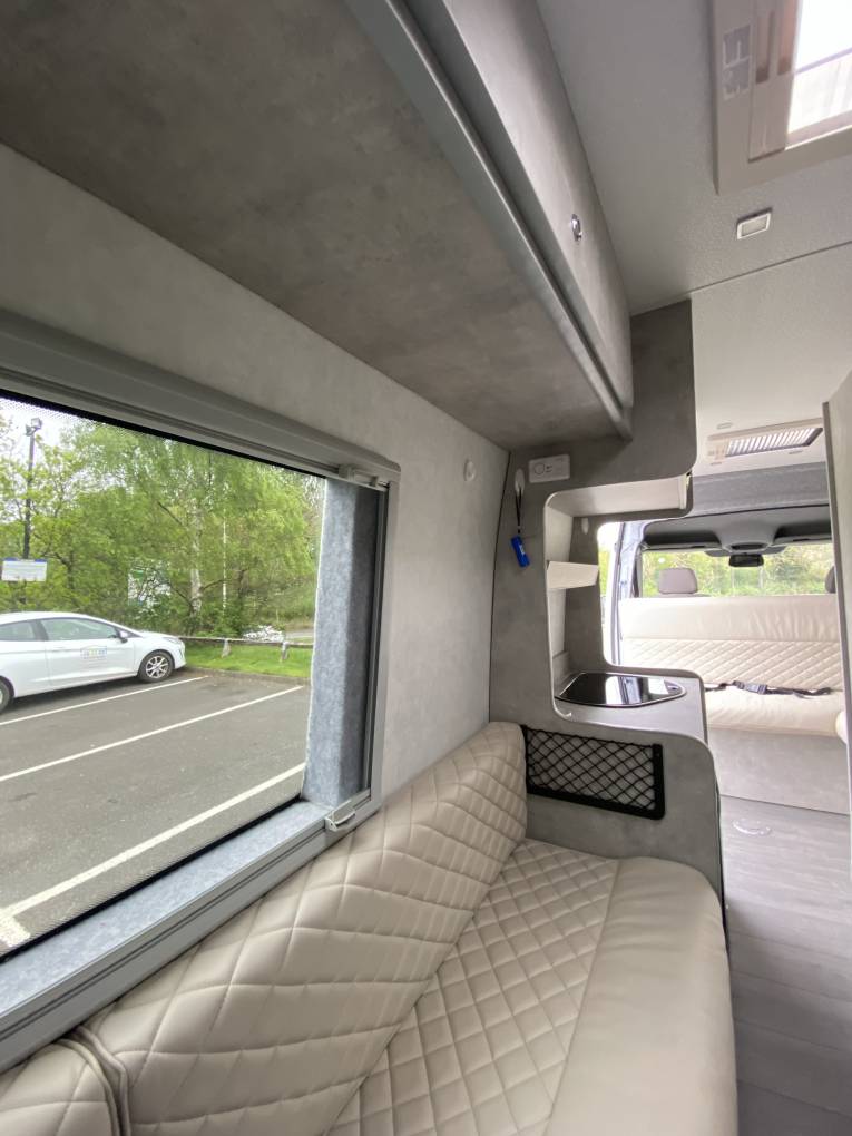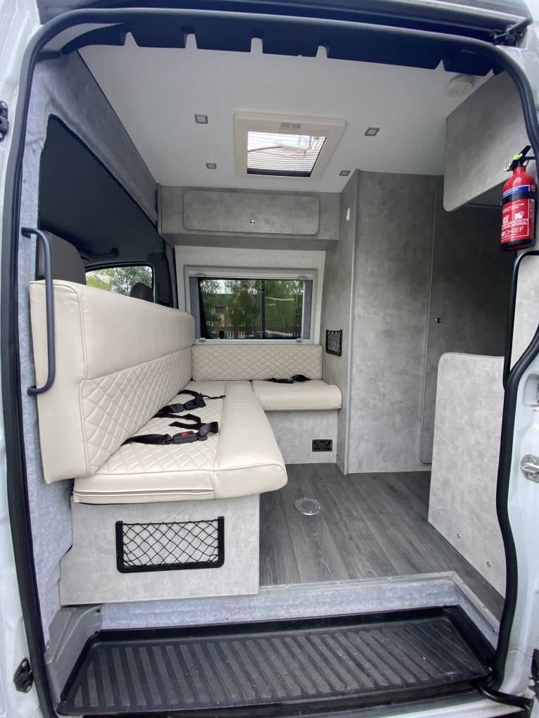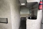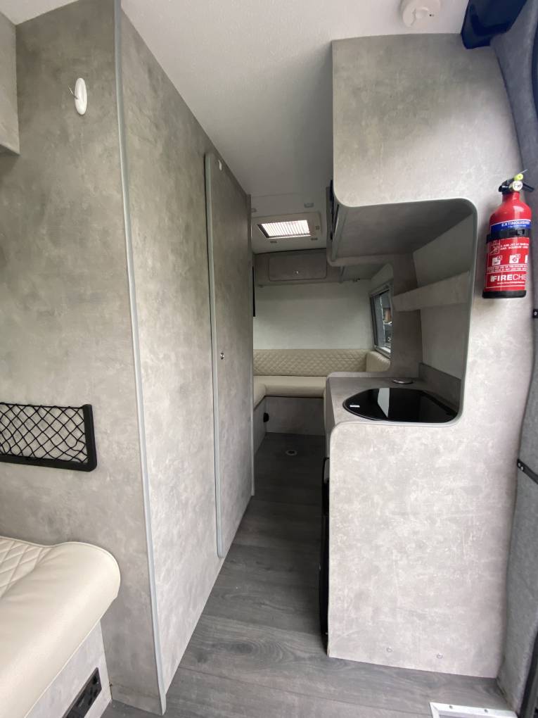 The sitting area is large and comfortable and converts into a spacious queen sized double. There is a television and ample cupboard, lighting, USB and plug points which make this area comfortable to relax in. There is spot lighting around the floor area and ample lighting throughout. Privacy is sought by tinted windows along with full Remmis blinds throughout. Heating is by means of a diesel heating system that heats the van up quickly and keeps it cosy in the colder months making it ideal for off grid use. There is a hot water tank with 120ltr capacity.