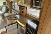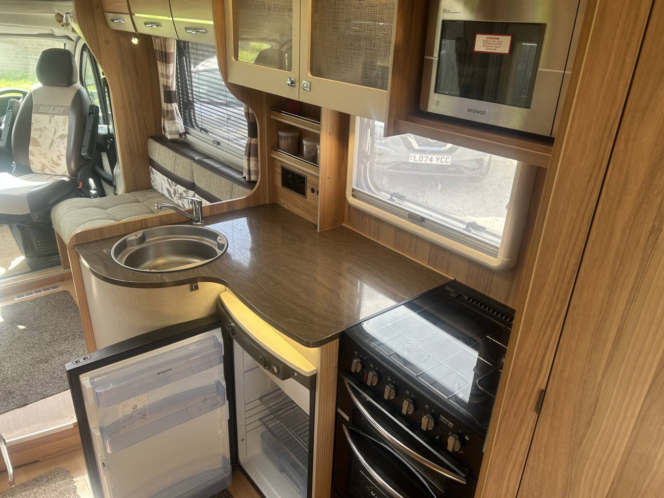 As mentioned the 730 has a fantastic living area. At the front you have the lounge which comprises of the two side facing bench sofas as well as the two Captains chairs that can be swivelled around. Moving to the centre of the motorhome you have an extremely well equipped kitchen area. This includes an oven, grill, duel fuel hob with gas burners and an electric hot plate, sink with mixer tap, 3-way fridge with ice compartment and microwave oven. There are loads of cupboards and storage space for all your food, drink and utensils.