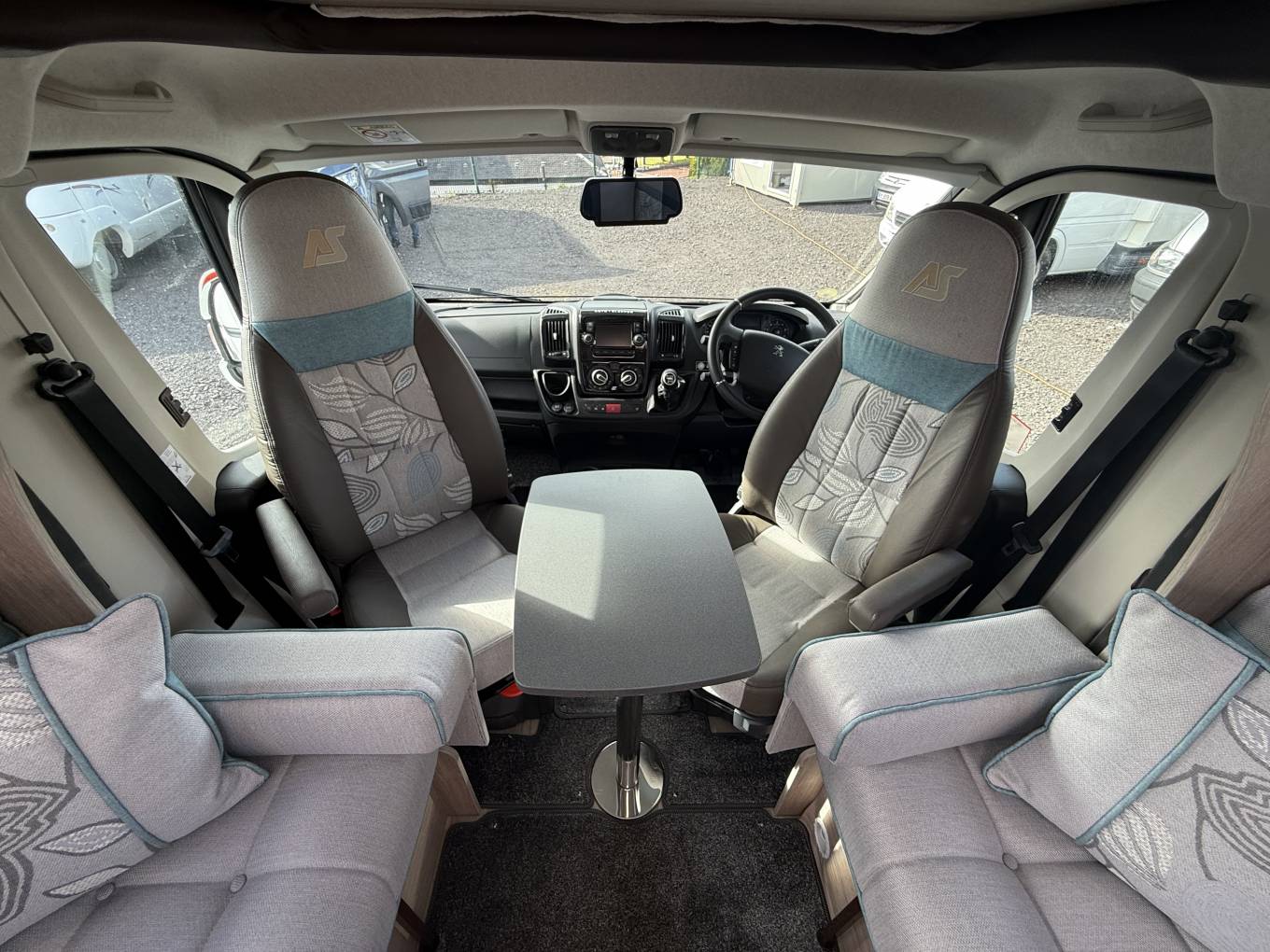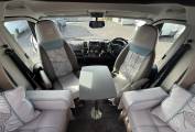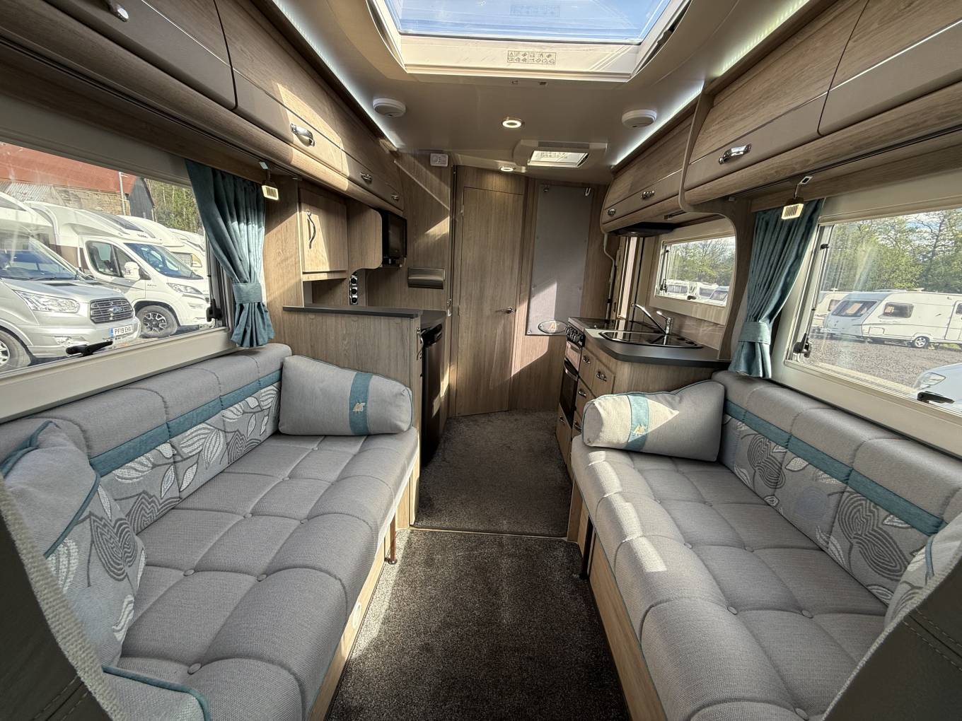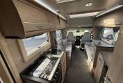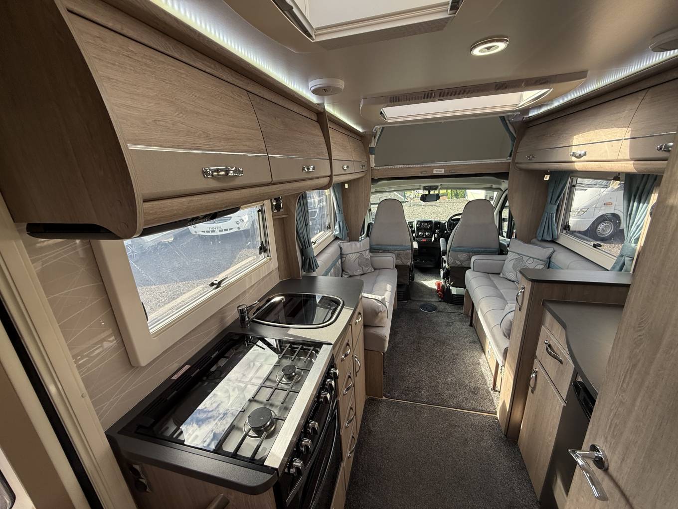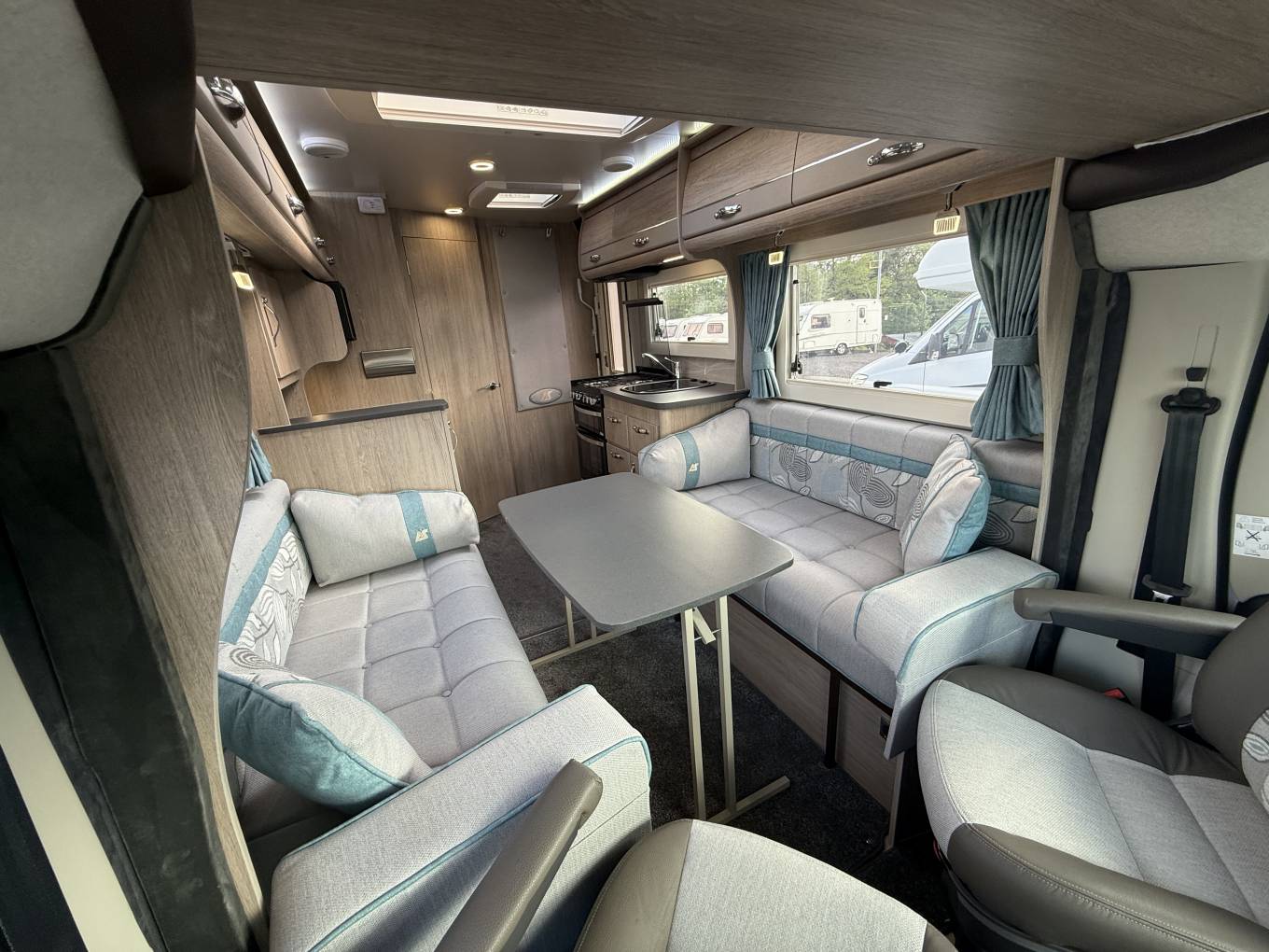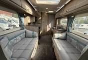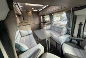 The impressive front lounge area has two side sofas that pull together in the evening to make a large double bed, large side windows and a sunroof provide plenty of natural daylight, a large dining table that stores in a dedicated locker when not in use, both front seats swivel to face the lounge and there’s a smaller table that fits in front. Upper aircraft style storage lockers and under seat storage available. and above the cab you have a panoramic sunroof and the over cab bed giving this motorhome 2 extra berths or additional storage space.