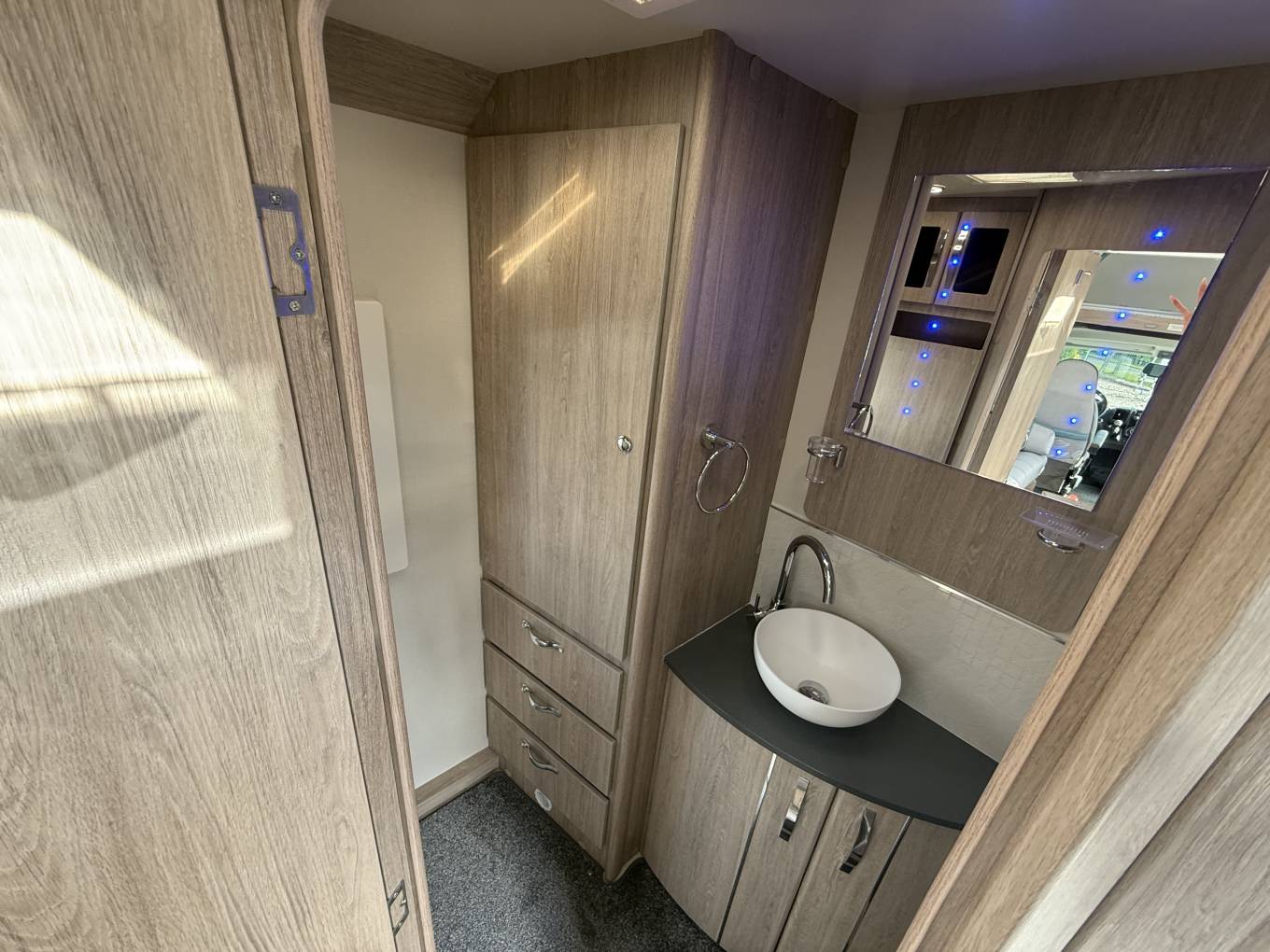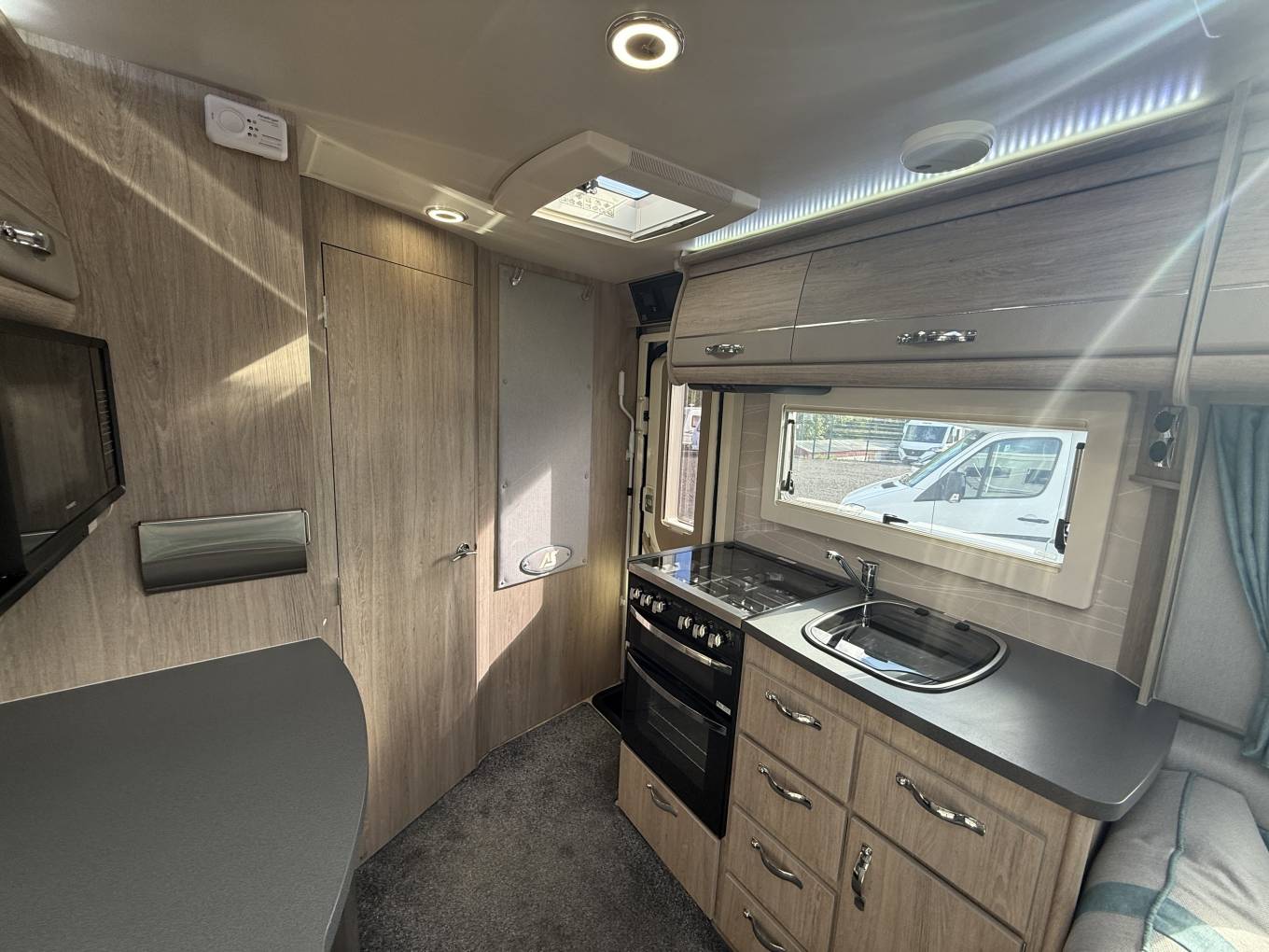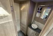 The layout is from the rear using the electric step, enter the van and the end ensuite modern washroom is immediately to your right, with a designer bowl washbasin and chrome tap, vanity cupboard with LED lighting, a Thetford cassette toilet with electric flush, plus a large separate shower cubicle with Perspex door, there are cupboards and a large wardrobe with hanging rail. Moving forward you have the kitchen area which is well specified with a dual fuel hob with 3 gas burners and an electric hotplate, gas grill and oven beneath, a stainless steel sink with chrome mixer tap, opposite is a large counter space area with a Thetford 3-way powered fridge below, a microwave oven above, plus plenty of cupboards and drawers to store-away all your holiday provisions and cleverly behind one cupboard door is the AVTEX TV with built-in DVD player, which pulls out on an extending bracket.