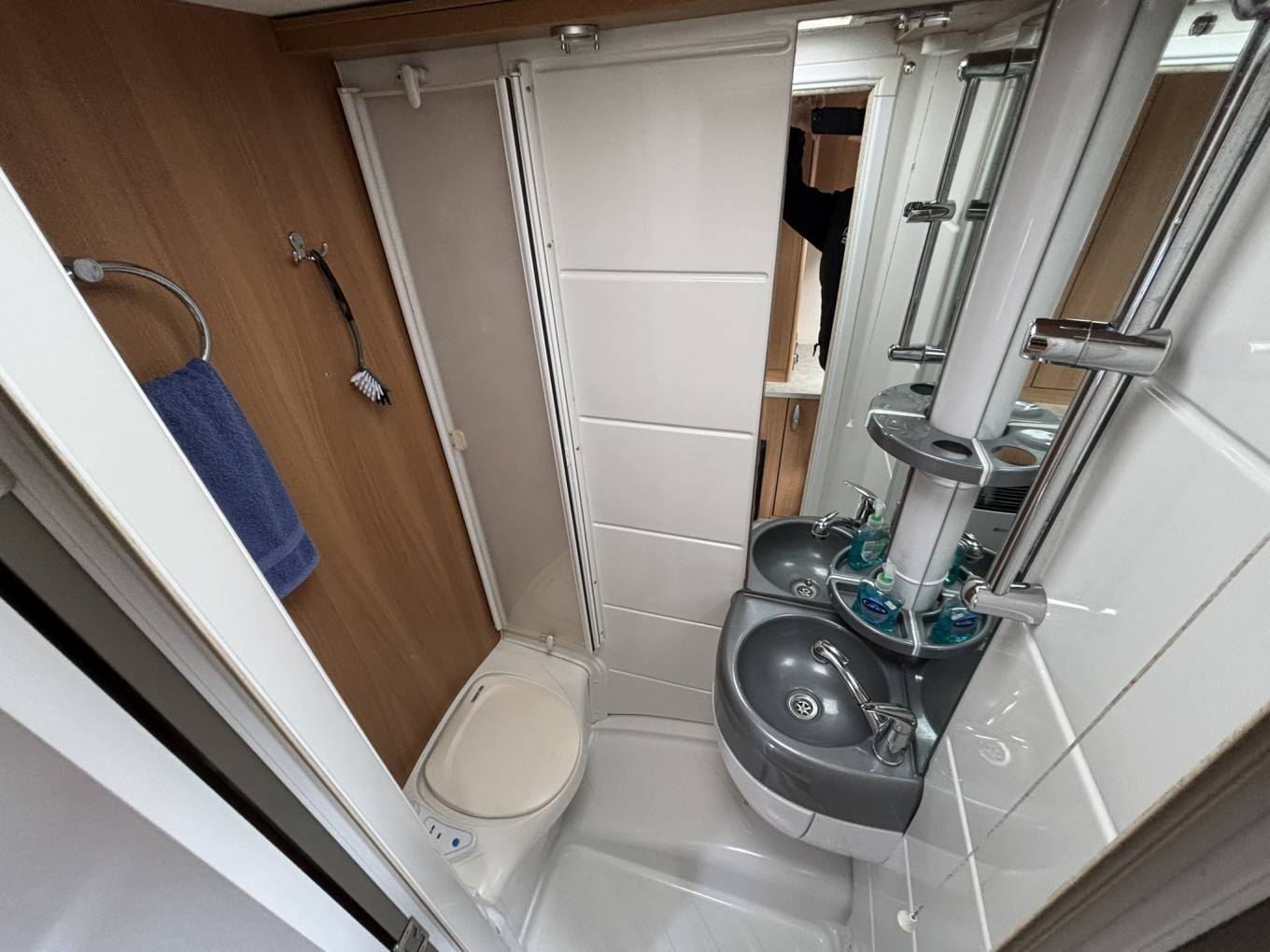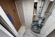 Moving to the rear of the motorhome behind the dinette is the washroom, with a 12volt flush cassette toilet, wash handbasin with double mirror behind and mixer tap which is also used in conjunction with a raiser rail to give a shower.