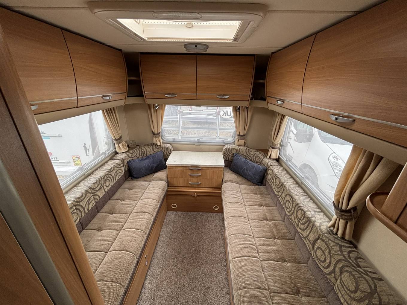 Opposite the kitchen area is the dinette with the table and rail table system which seats 4 and converts to a double bed. These seats with under storage are the belted seats which also benefit from the table while travelling. There are also 3 storage cupboards above where you will find the Sargent consumer box located.