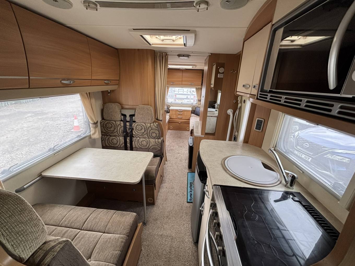 You enter the habitation area of the motorhome through a door on the passenger side of the vehicle with an electric step. To your left is the kitchen area, which has a Thetford fridge with icebox and a Thetford gas oven and gas/electric combi hob. There is a sink with mixer tap and worktop with benefits from a flip up worktop for extra space when required.