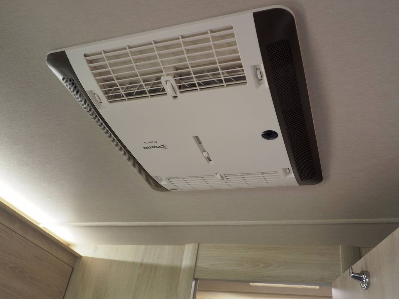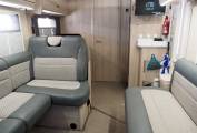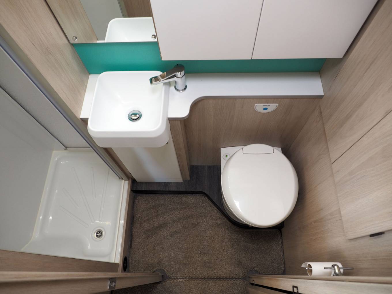 At just 6 metres body length the F60 offers roomy accommodation with swivel cab seats facing the corner and side dinette seating, giving plenty of relaxing space. An occasional bed can be made here, while the electrically lowering double bed has options for a low or high position. Onboard facilities include fresh and waste water tanks, dual fuel heating and hot water, external shower, a well equipped corner kitchen with 3 burner gas hob, oven and grill, large fridge freezer and a range of drawer and locker storage, while above is the Truma remote controlled 230v habitation air conditioner. Across the rear is a generous washroom with solid lined shower cubicle, toilet, vanity sink and large wardrobe.