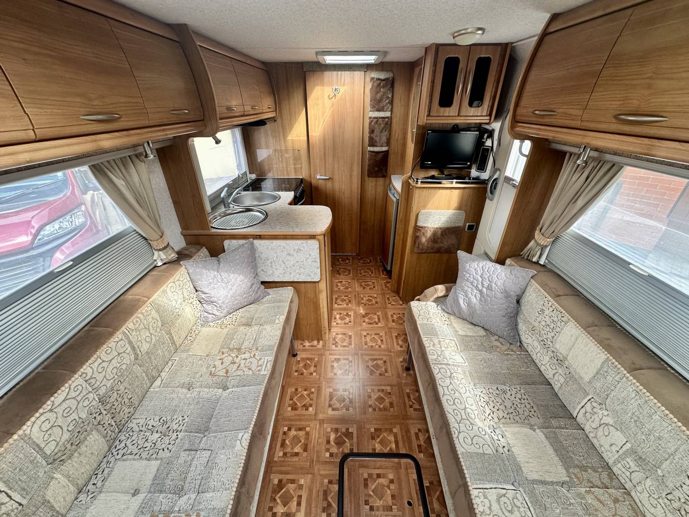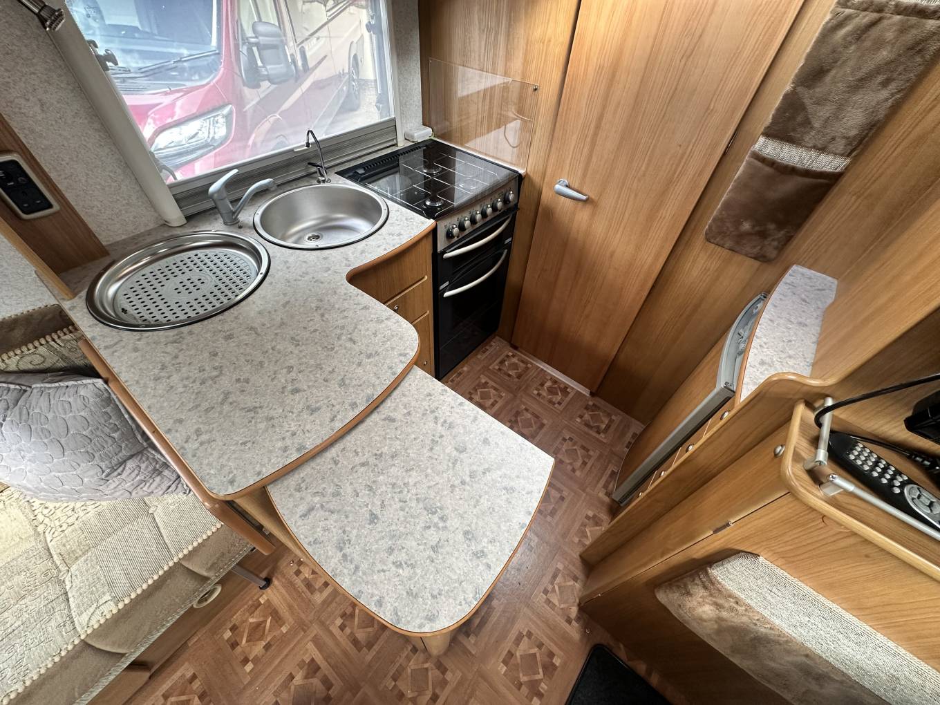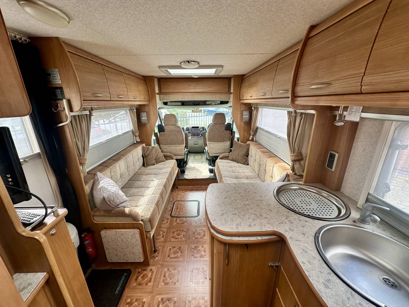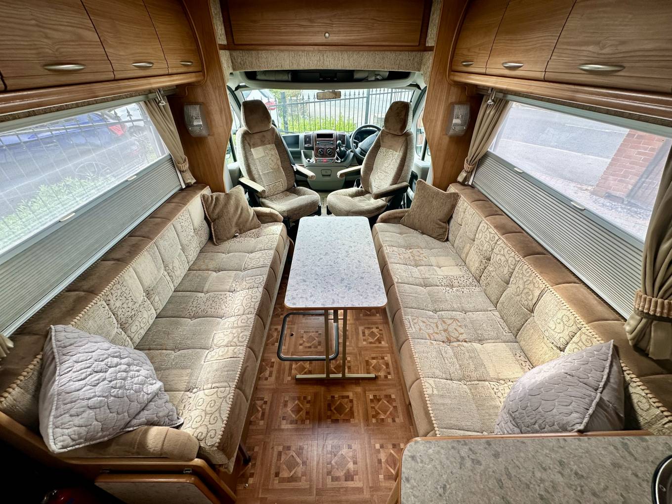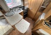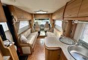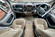 Starting at the rear of the motorhome you will find the spacious end bathroom including a separate shower, Thetford cassette toilet with electric flush, washbasin with mixer tap and storage. This makes for a useful dressing room area. Moving forward is the well-equipped L shaped Kitchen including an oven, grill, 3-burner hob, electric hot plate, 3-Way Dometic fridge with freezer compartment, sink with mixer tap and drainer. For more workspace the kitchen unit swings into the middle of the van and there is also a fold down worktop. In the heart of the motorhome you will find the dinette area. There are 2 bench seats at the front which can be made up into 2 long single beds or a large double. The sleeping arrangements are both versatile and practical. Both front seats Swivel and there is a useful foldaway dining table enabling dining for up to six adults.