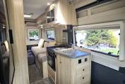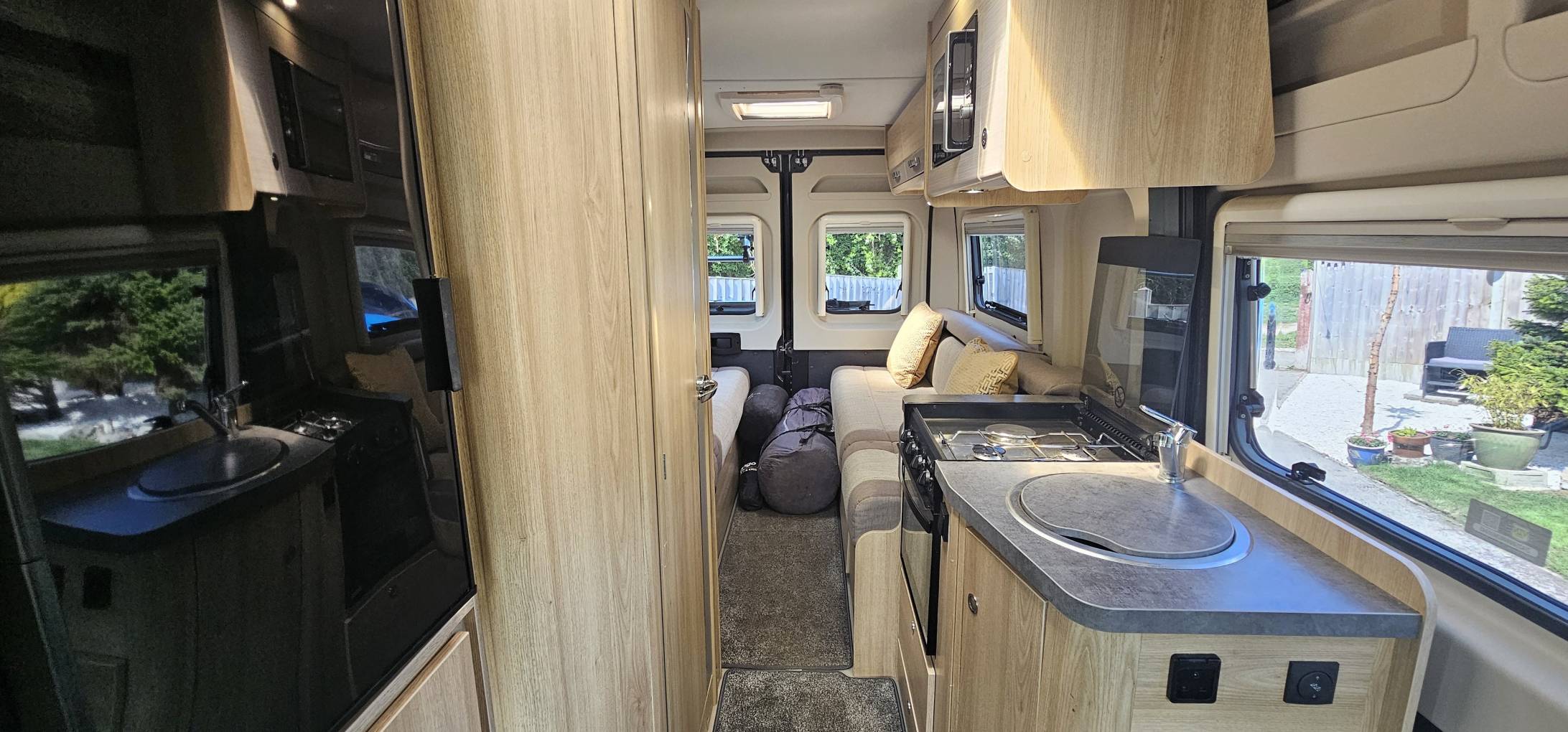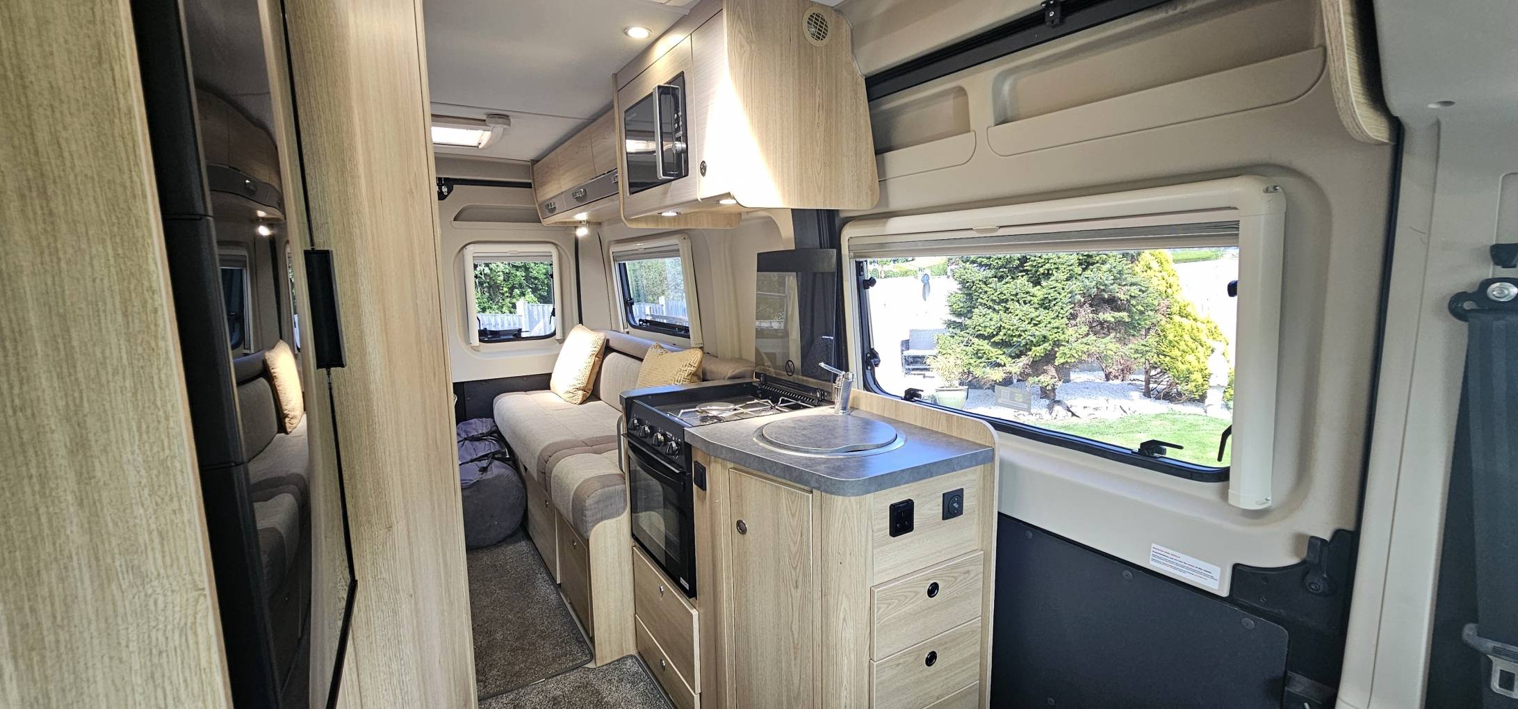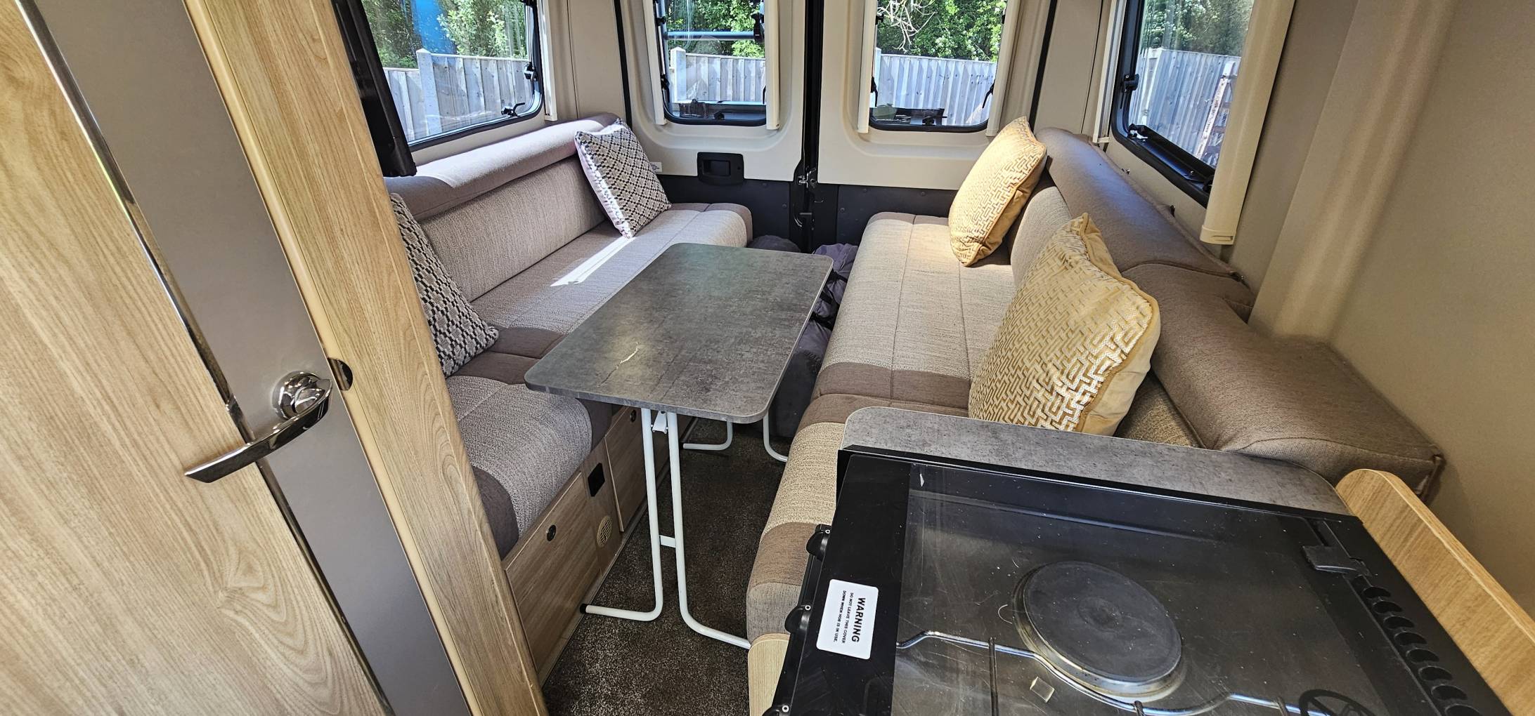 The Elddis Evolution CV20 offers a compact and functional layout, featuring a spacious rear lounge that converts into a sleeping area. Inside, you will find a fully equipped kitchen with a hob, oven and grill, microwave, sink, and fridge, alongside a compact bathroom with a cassette toilet, shower, and basin. The Whale dual-fuel heating system provides comfort year-round, supported by fresh and waste water tanks.