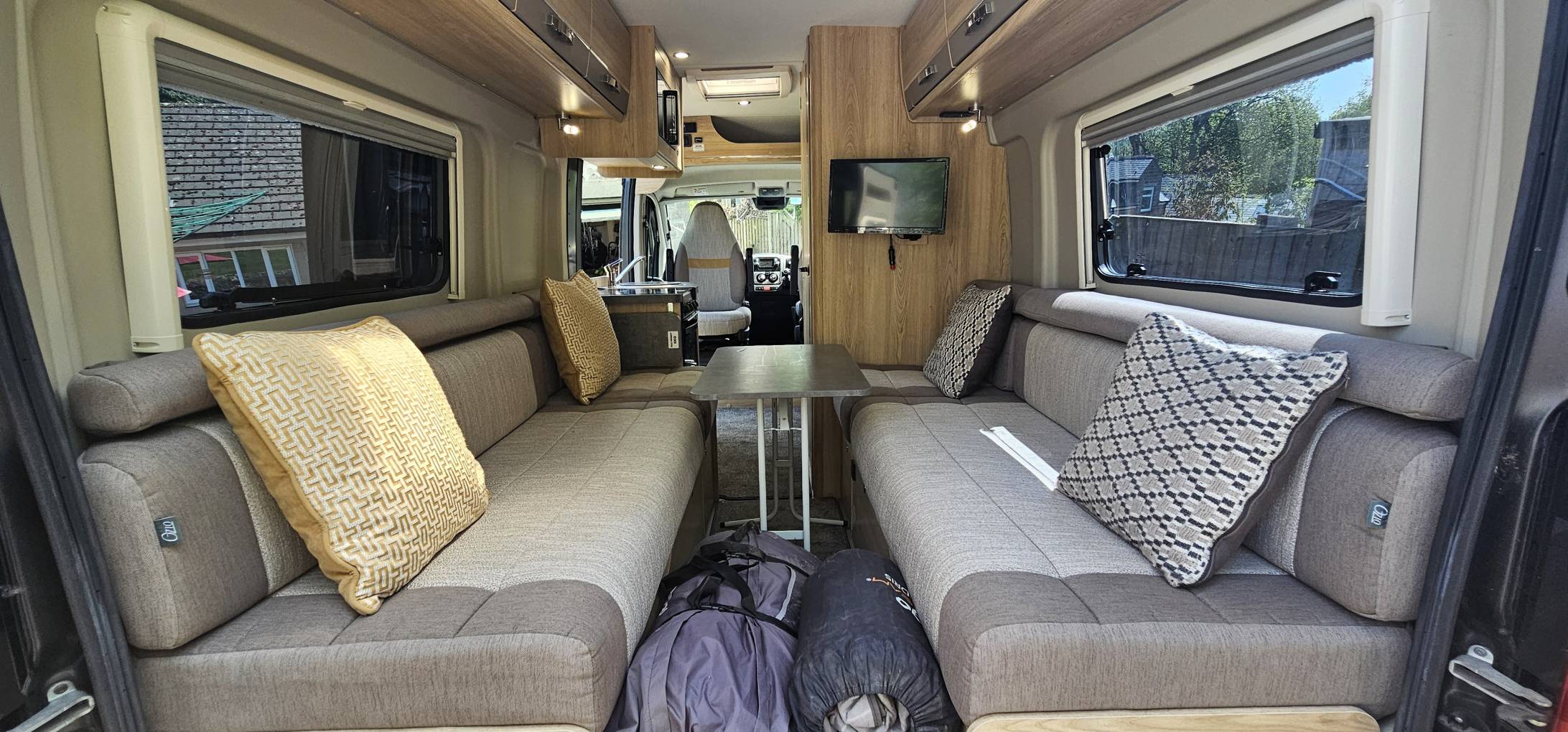 Additional features include a solar panel, refillable LPG system, leisure battery, swivel cab seats, air conditioning, cruise control, DAB radio, and ample storage throughout. This sale also includes a 12V TV, a VanGo AirAway Kela II Tall Drive-Away Awning, and a bike rack for two bicycles. The seats have been covered from new, keeping the upholstery in excellent condition.