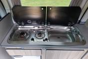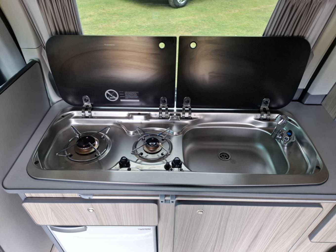 There is an offside essential side kitchen with a hob with two gas burners, a fridge with a freezer box, and a sink.