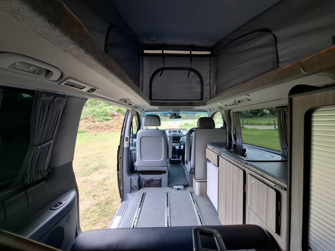 The habitation area behind the cab has a forward-facing double seat (with two additional seat belts) which can be further enhanced by the passenger swivel cab seat and use of a removable table. There is a pop-top roof, which permits standing in the leisure/dining area.