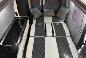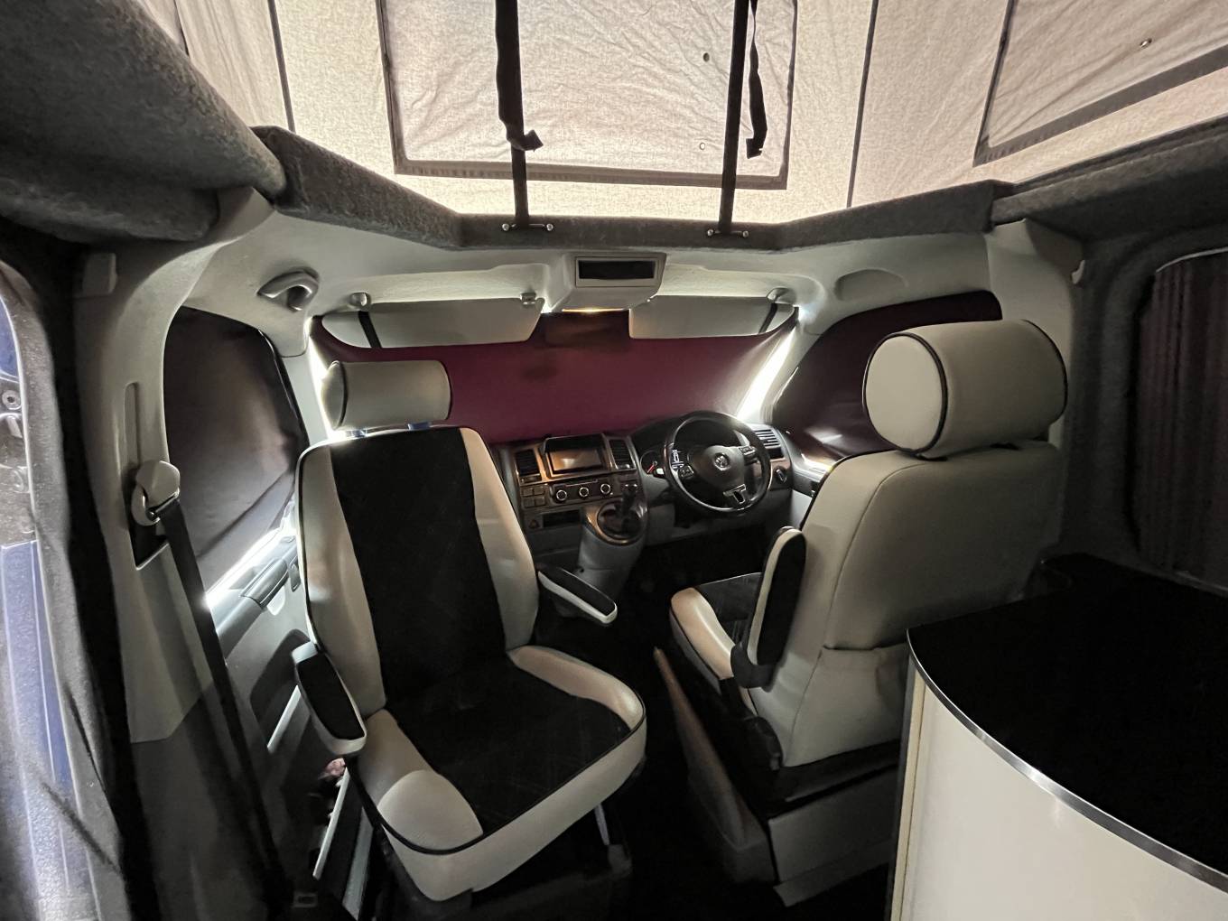 This 2010 model strikes a balance between modern reliability and classic camper appeal, featuring a solid diesel engine, good fuel efficiency, and proven mechanical dependability. The appeal of this van comes with its unique styling features inc. 20” Alloy Wheels and extended chrome finishes on the wing mirrors, fuel filler cap and tubular running boards complementing the Blue and White Paint and Decals. Internally the rather stunning finished units matching the seating with LED lighting that can change colour to suit your mood again enhance the look of this camper.