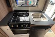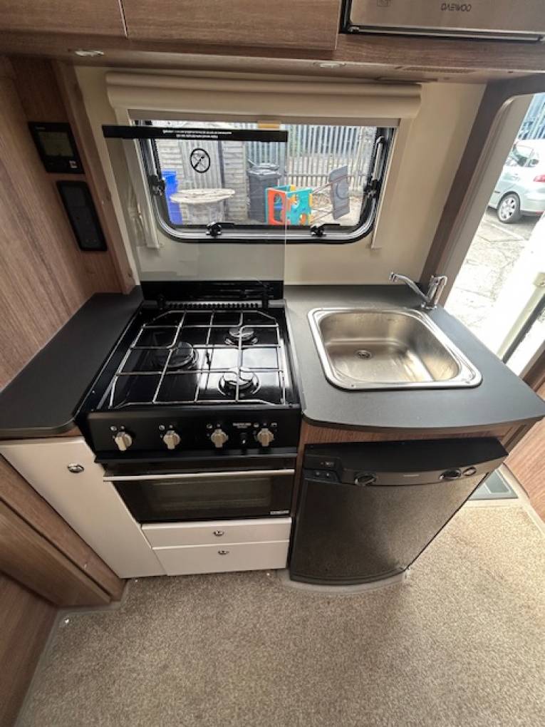 The kitchen consists of a hob with 3 gas rings, sink, oven grill, fridge/freezer compartment, microwave and additional workspace provided by elevating leaf.