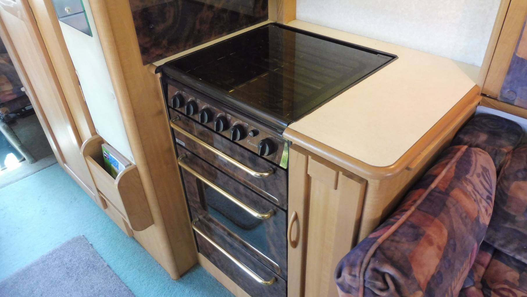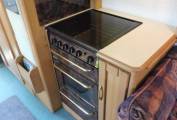 Moving forwards is the kitchen which sits on both sides of the van. A full oven with separate grill and 4-burner hob on the offside, the fridge and sink are opposite. There is plenty of usable worktop as a result.