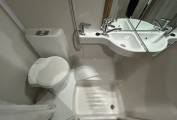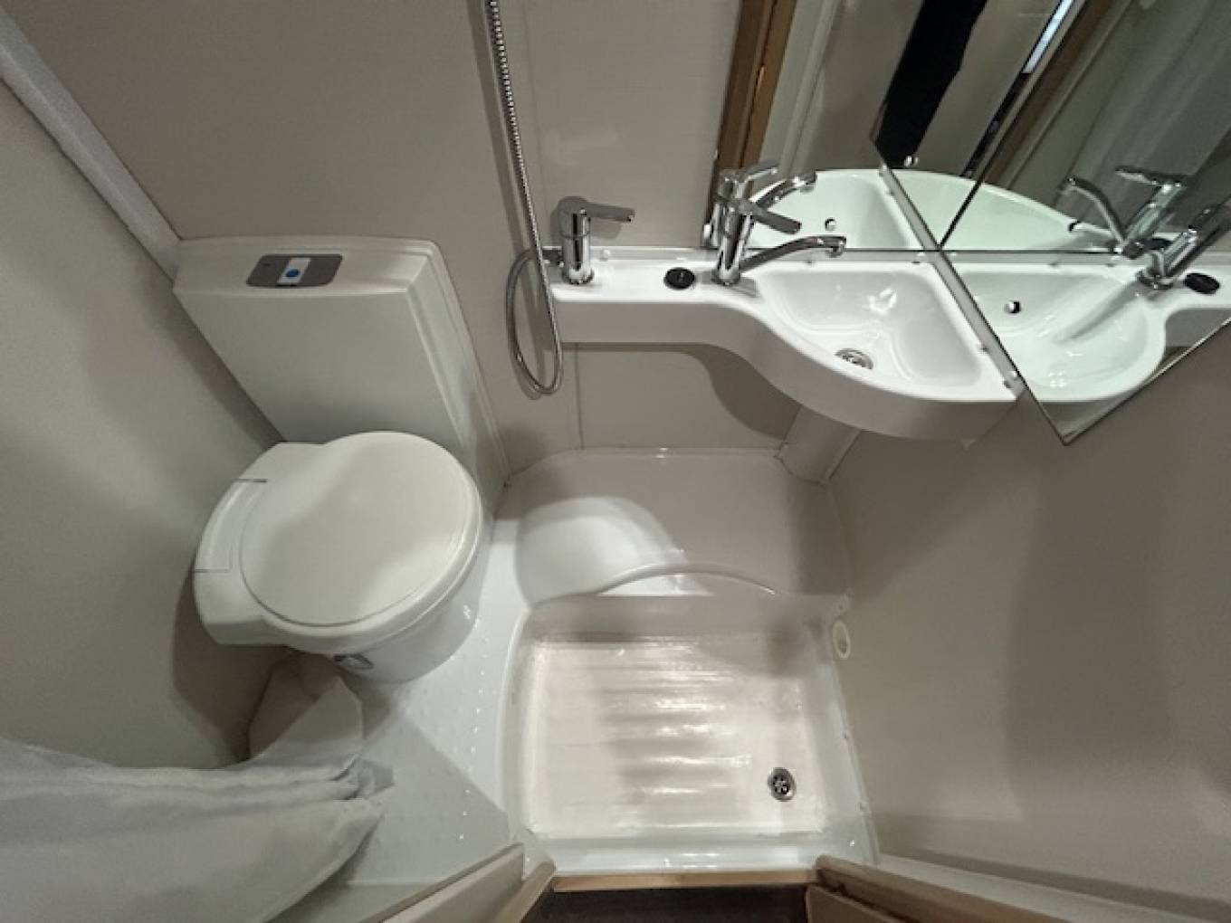 The central washroom comes equipped with a shower and curtain, toilet with cassette, washbasin, vanity unit and additional storage.