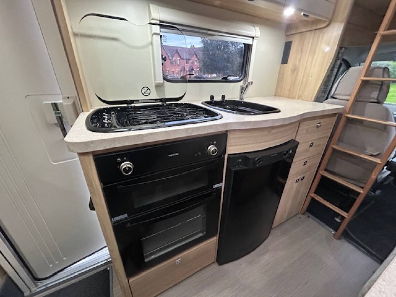 The kitchen is equipped with a three ring gas hob, oven/grill, a Dometic fridge/freezer, a sink and plenty of storage room.