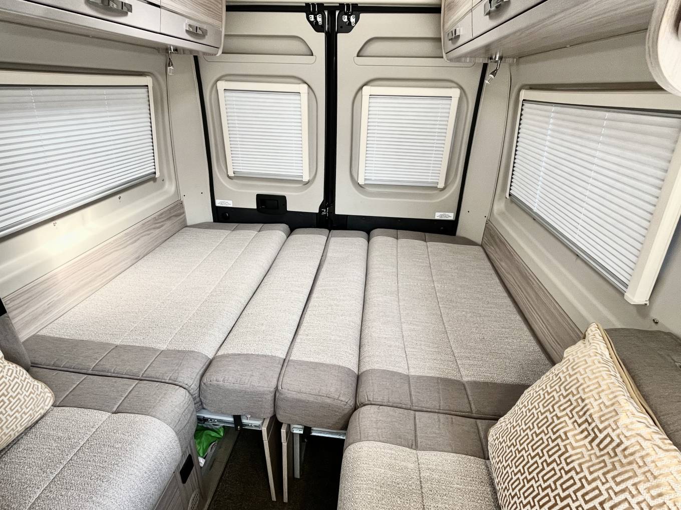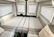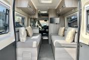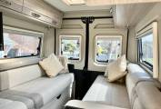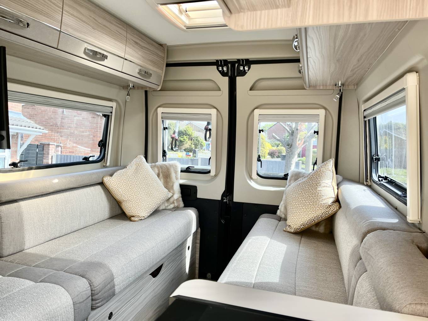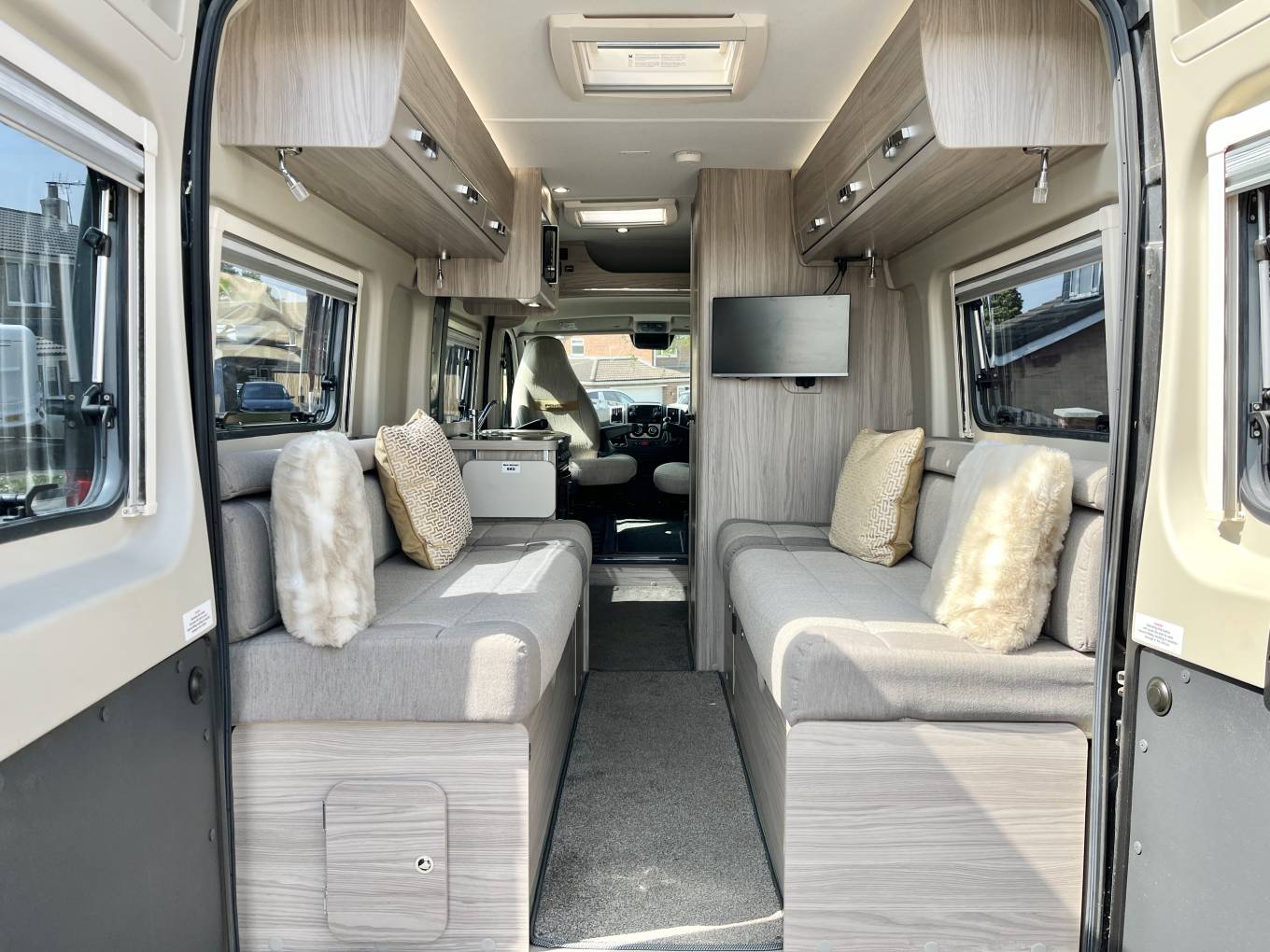 This two berth, 2 belt motorhome is ideal for both singles and couples alike, to the rear of the van is a good sized socialising and relaxing lounge area with plenty of overhead storage lockers and further storage below each bench seat. This area can easily be converted into a sleeping area with either two single beds or a transverse double bed. Habitation heating and hot water supplied by a dual fuel Whale system.