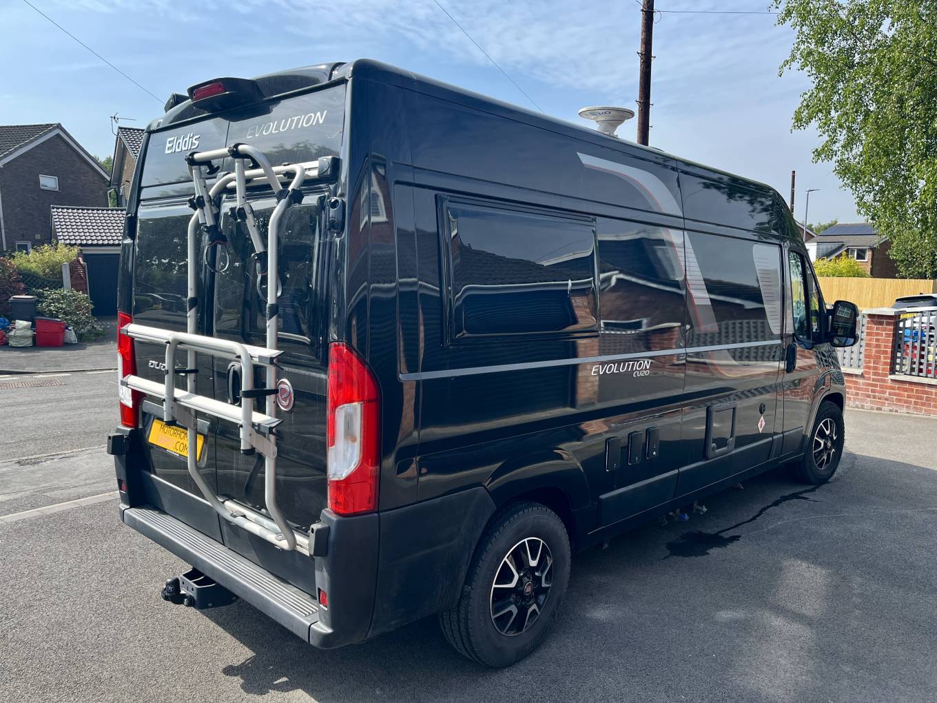 To the exterior we have alloy wheels, 100W solar panel, electric entrance step, 2 cycle bike rack, TV aerial, 25 L underslung LPG tank, Tracker for security.