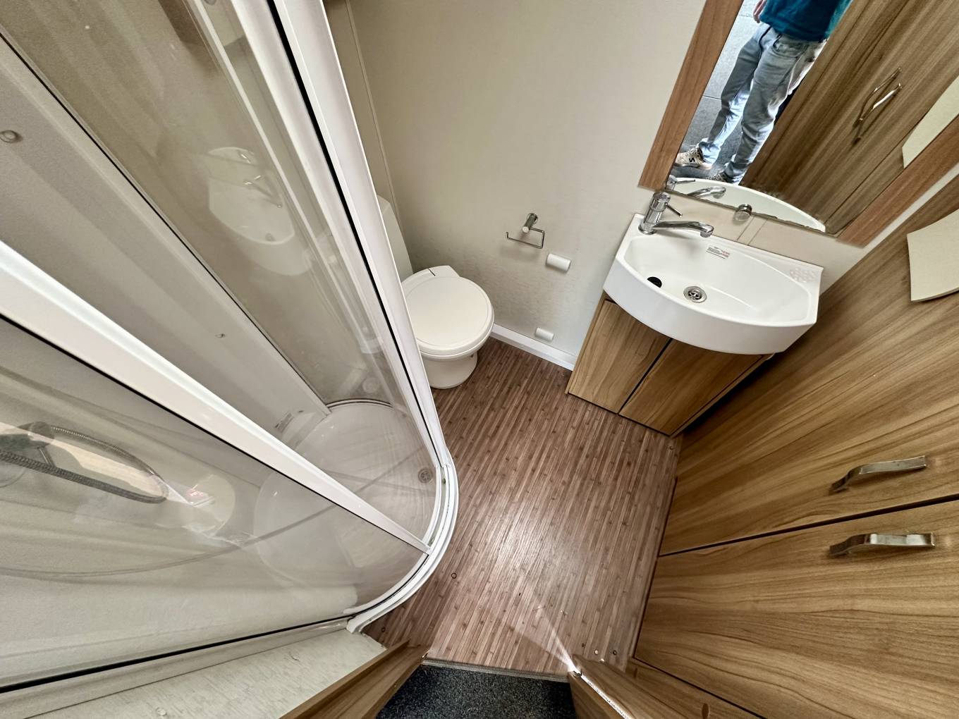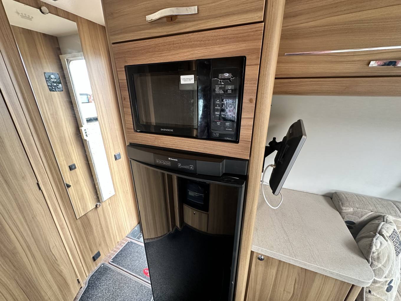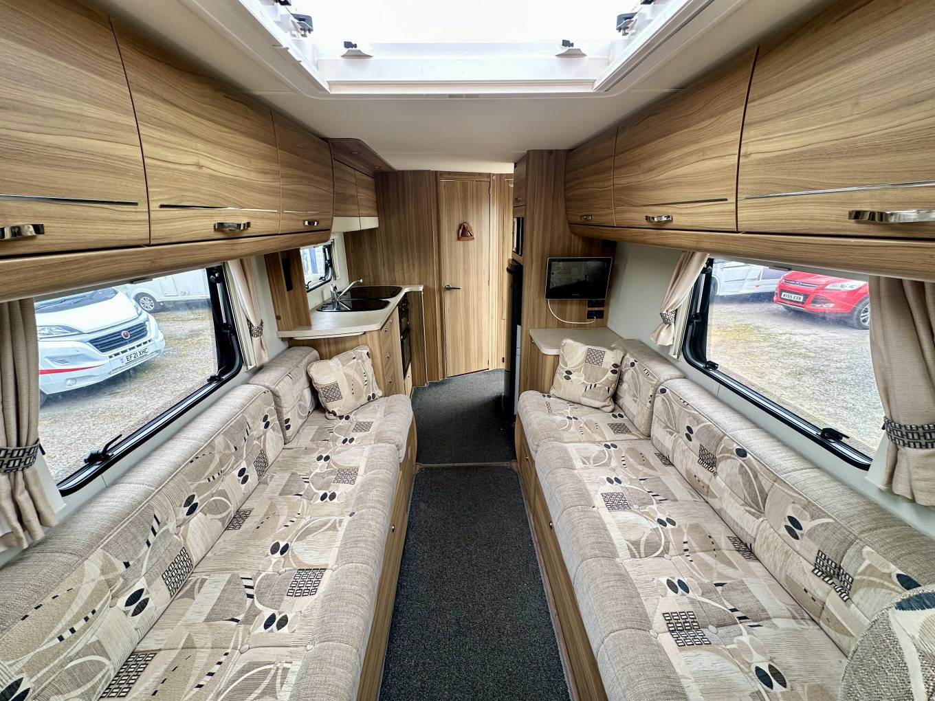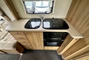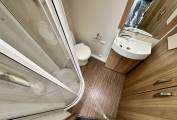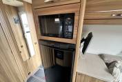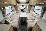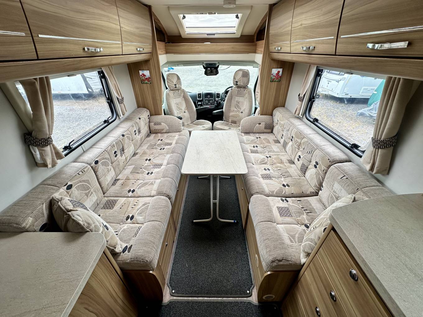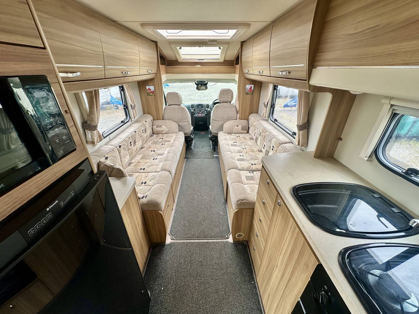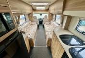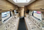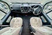 At the rear of the motorhome, you will find the spacious end washroom/ changing room with separate shower, cassette toilet with electric flush, vanity unit with large mirror and storage and floor to ceiling double wardrobe. Moving forward you will find the central kitchen including a dual fuel gas & electric hob, grill and oven, black gloss sink with mixer tap, worktop extension, large fridge with removable freezer, microwave and plenty of storage. In the heart of the Motorhome, you will find the light and airy dinette area complete with two large side sofas which can be used as single beds or easily converted in to a large super kingsize. The driver and passenger seats both swivel and there is a large removable table proving extra flexibility for you and your guests.
