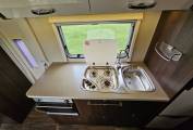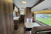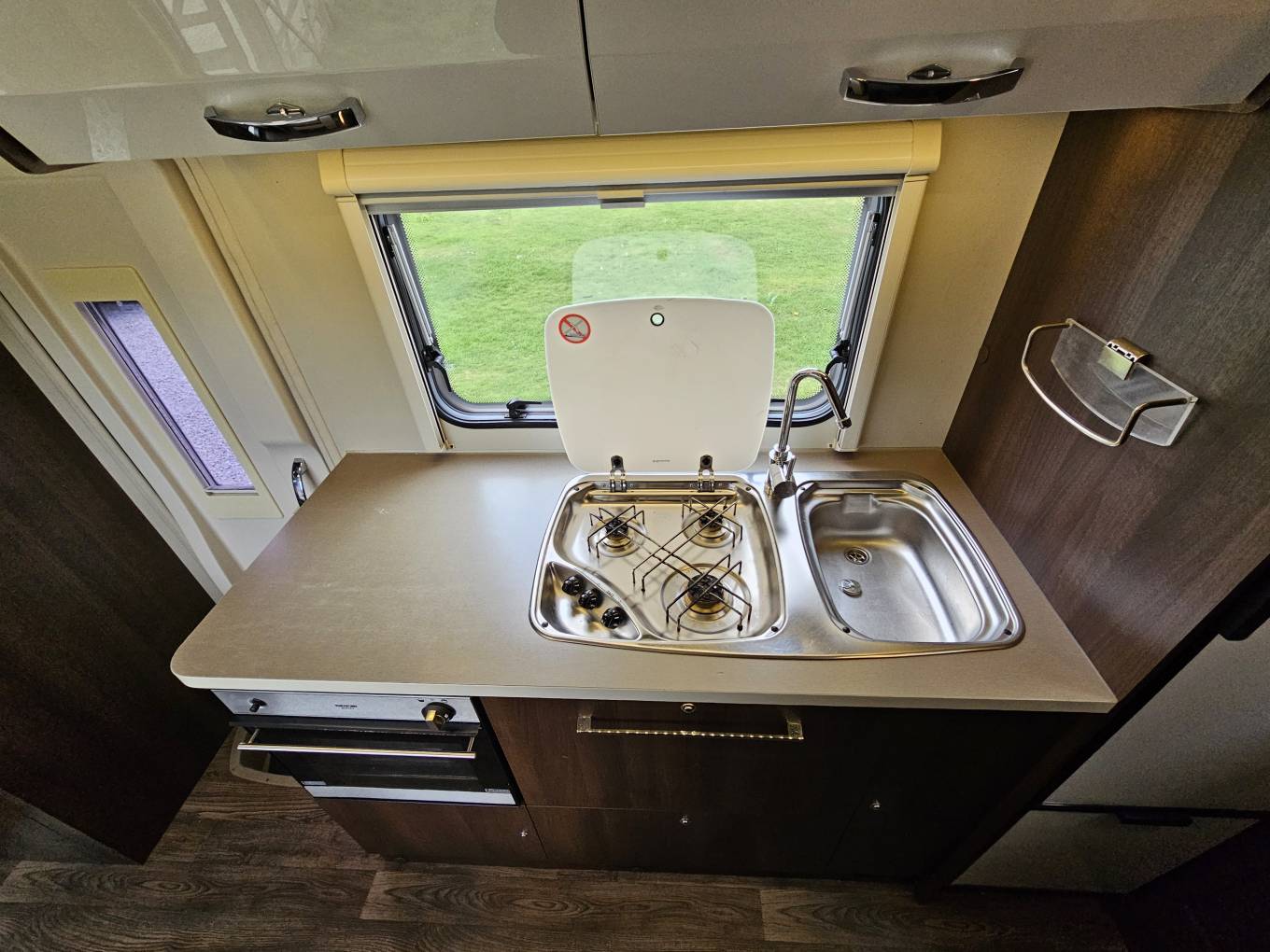 The kitchen is fully equipped with a three burner gas hob, sink with mixer tap, integrated Thetford oven and grill, and a tall fridge freezer, providing ample food storage. Glossy overhead lockers offer plenty of space for kitchenware.