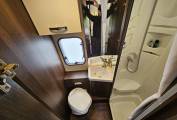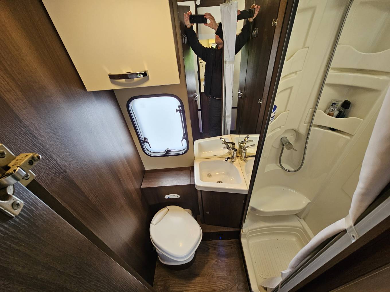 The washroom is spacious, featuring a cassette toilet, a sink with a vanity unit and mirror, and a separate shower cubicle with shelves.