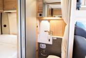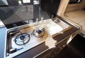 The rear fixed transverse double bed can be stored to provide through access to the rear with a 3rd and 4th berth provided in the pop top and accessed via a removable ladder. The front dinette is a great place to relax, dine and entertain with the driver and passenger captains chairs swivelling into the habitation area. The kitchen facilities include a two burner gas hob, sink with hot and cold water and a 12v fridge with freezer box. Plenty of storage in the overhead lockers and drawers provided. A private wash room with flushing cassette toilet, drop down hand basin and shower provides home from home comfort and a rare feature on a compact campervan. Heating and hot water from the onboard duel fuel Truma system with control panel. There is 230v electric hook-up and a 12v leisure battery. A rear tow bar and electrics fitted.