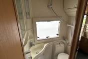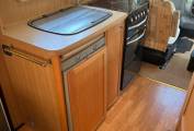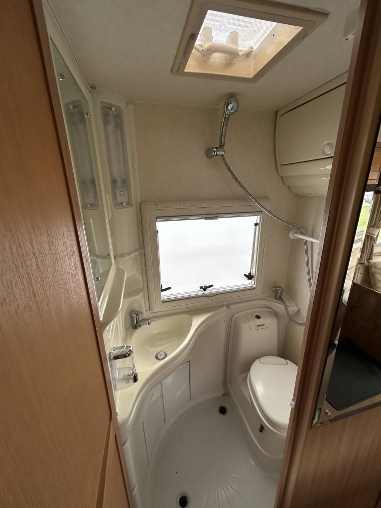 The washroom has a shower, a Thetford cassette toilet, a wash basin and mixer tap and 2 storage cabinets for your toiletries. A large window and a roof light provide plenty of natural light and ventilation for when you are getting ready.