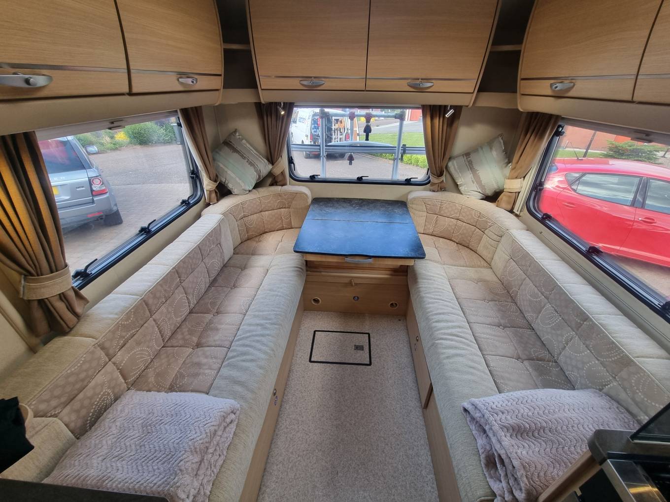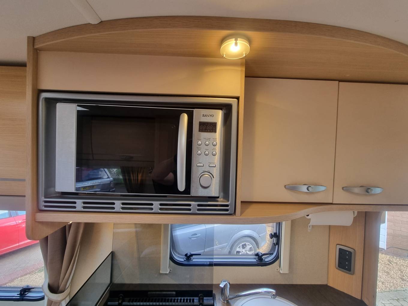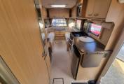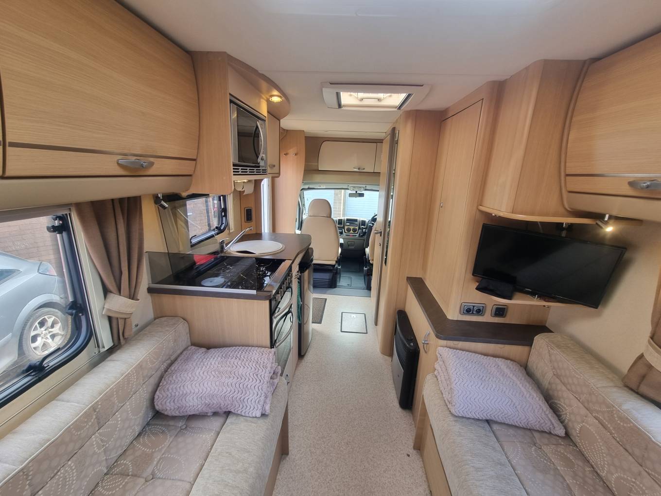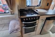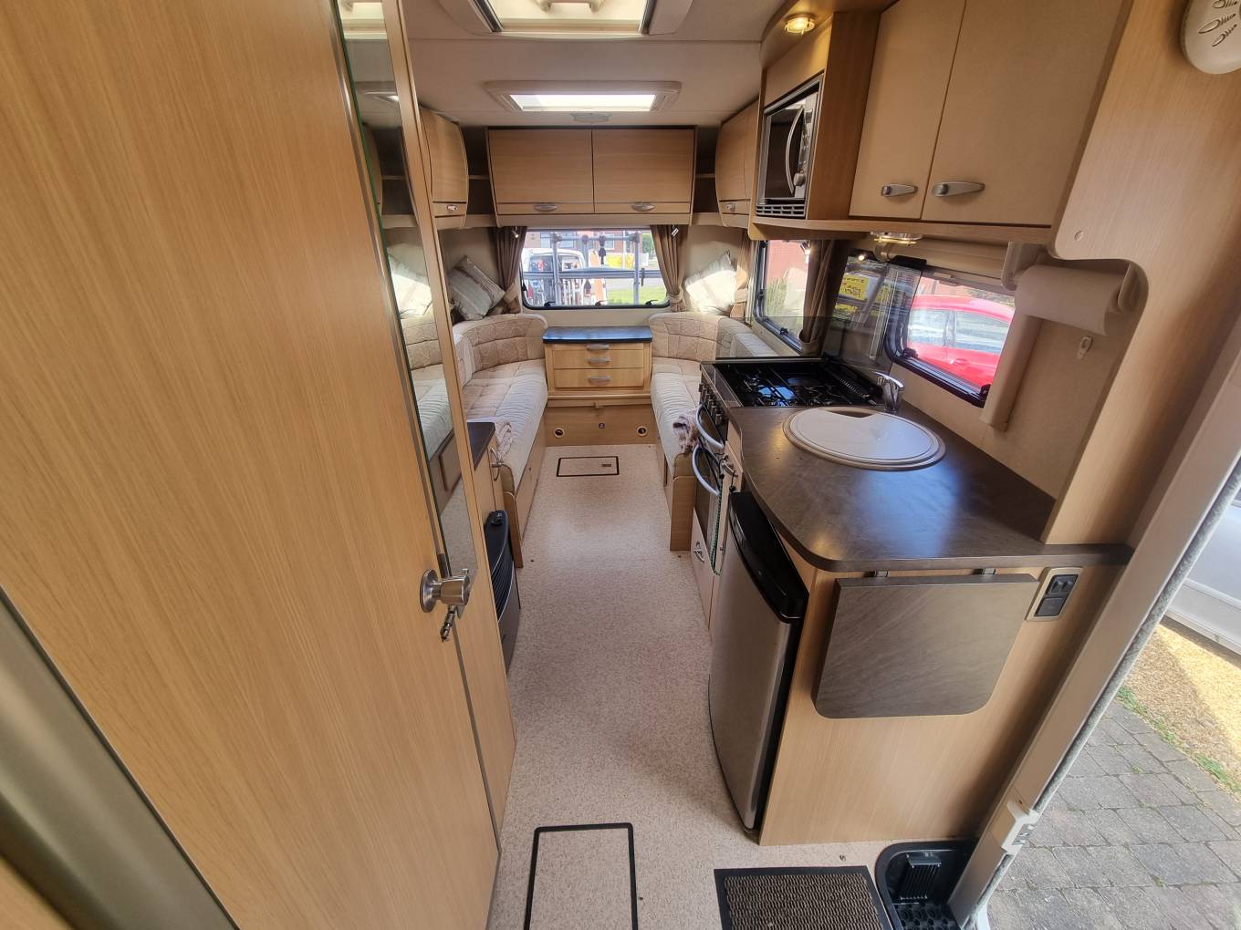 Interior: Rear lounge, side kitchen with dual-fuel hob, oven, microwave, and 3-way fridge.