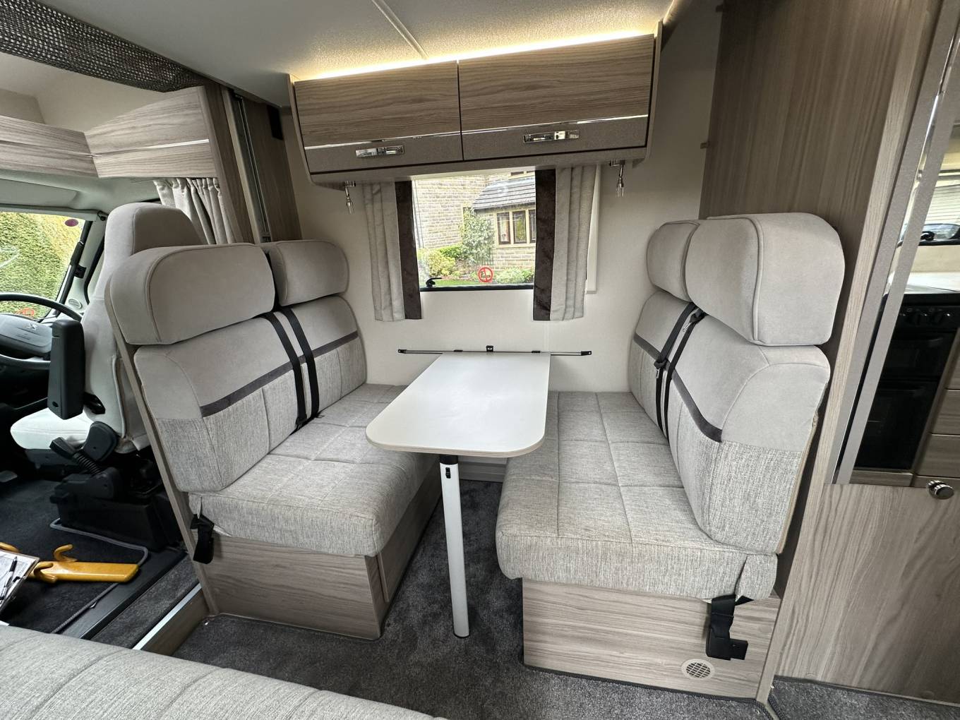 The motorhome is equipped with six belted seats, ensuring everyone travels safely and comfortably. The cab area features swivel captain’s chairs, seamlessly integrating with the main living space.