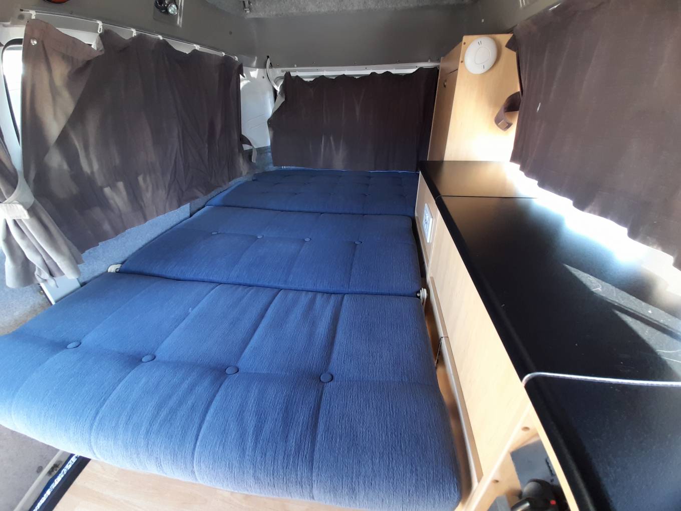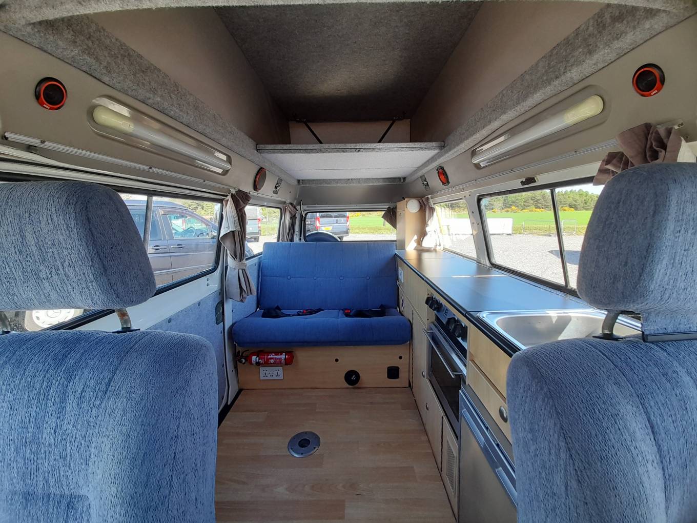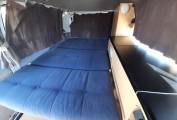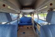 Sleeping – Rock and Roll bed, rear storage cabinets, overhead 12v lights. Plus a fold out carpeted roof bed with canvas sides.