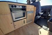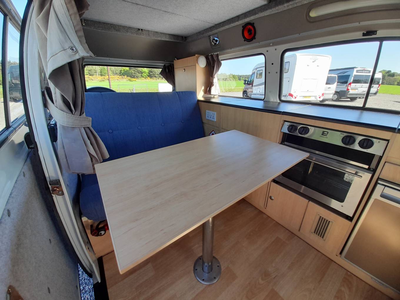 Kitchen – 2x Burner gas hob, cold running water. 12v fridge, generous storage for all your needs. Slide opening windows with curtains.