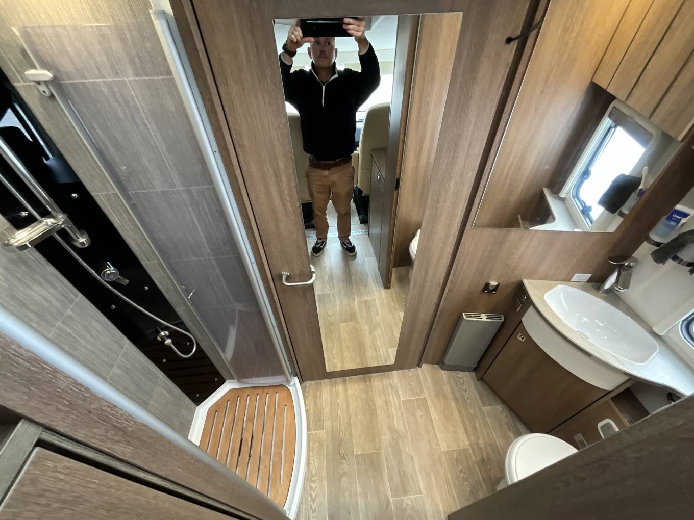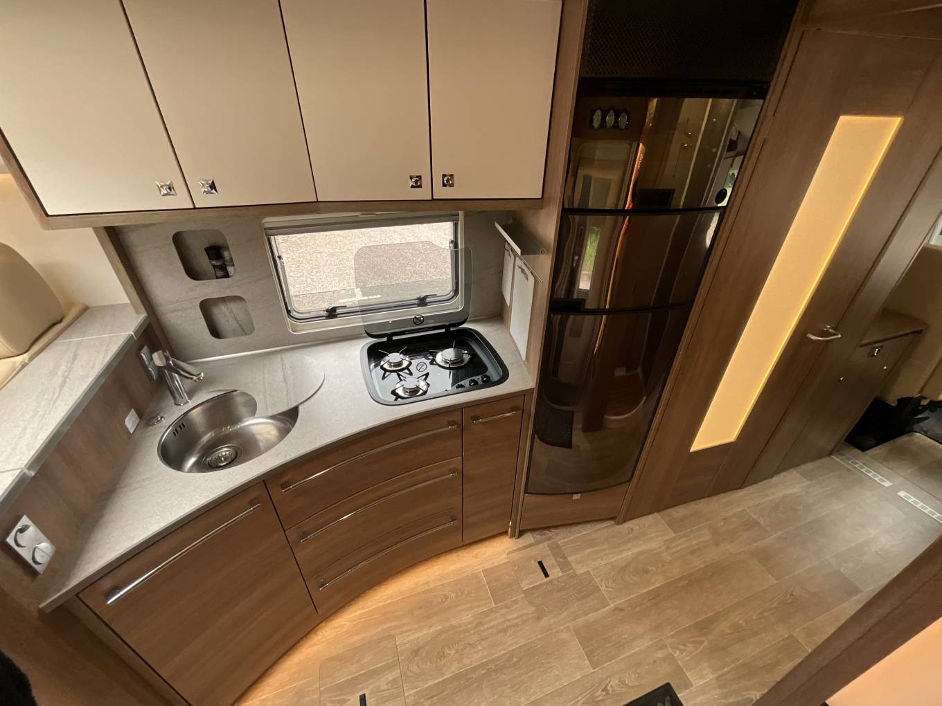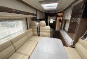 Starting at the back of the motorhome you will find the stylish wrap around lounge featuring a large flat screen TV with surround sound. This area is perfect for entertaining or relaxing and with an extendable dining table is great for enjoying meals. As evening nears this space conveniently converts into a spacious bed. Cooking on the road has never been easier as you step into the beautiful curved kitchen featuring a 3 burner gas hob, stainless steel sink with mixer tap, large 3 way fridge with separate freezer, oven, grill and copious amounts of storage. Moving forward you will find the well appointed washroom including a cassette toilet, vanity wash basin with mixer tap, large mirror and more storage. Opposite this is the separate shower cubical. This area can also be isolated to create an en suite style space, complete with full length mirror. Above the cab is a huge electric drop down bed complete with clever hide away steps that slide out from one of the two low level wardrobes. There is plenty of storage throughout the motorhome, including a large rear garage, allowing you to travel with all of your home comforts making you adventures enjoyable.